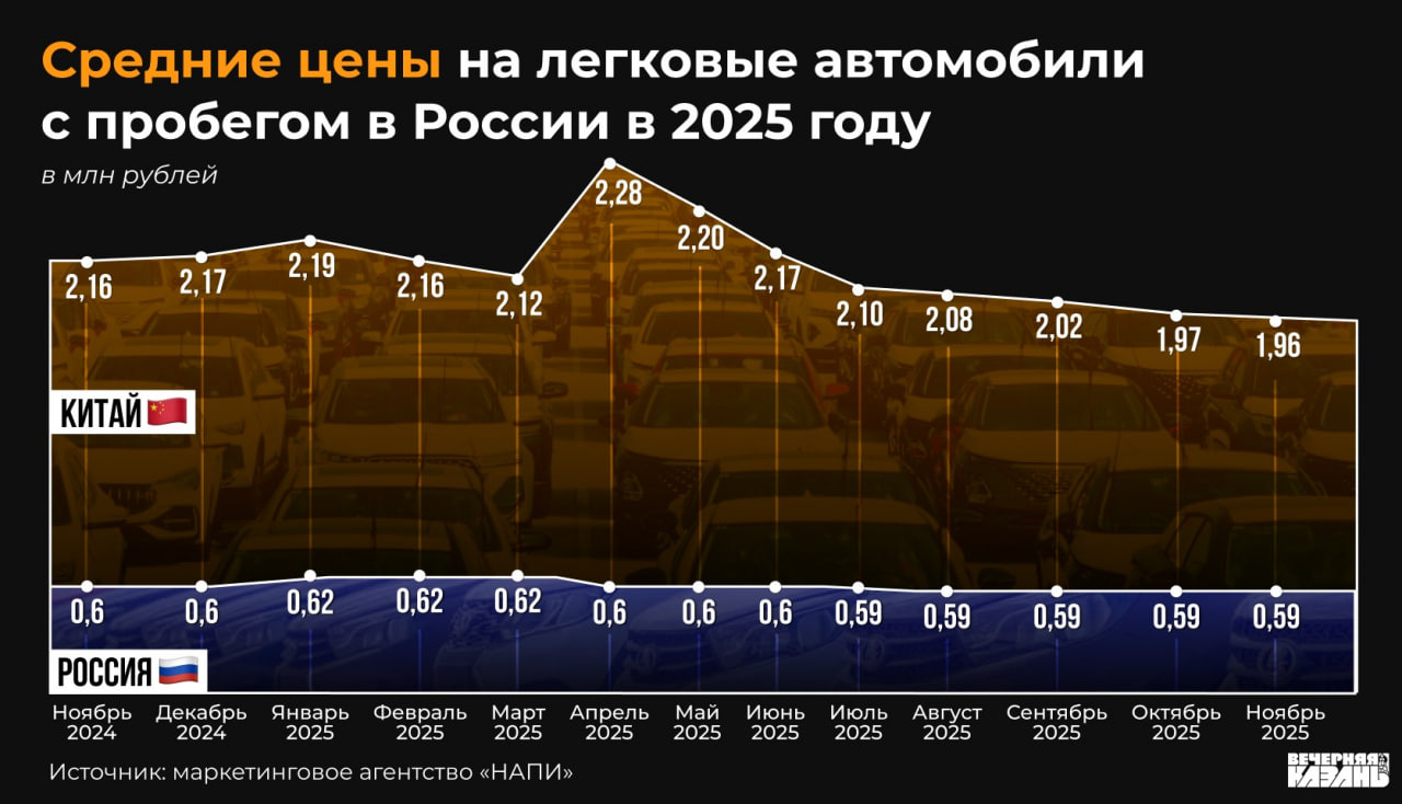 Более стабильны цены на российские машины. За год, с ноября 2024 года по ноябрь 2025 года, они подешевели с 603 тысяч рублей до 586 тысяч рублей (-2,9%). Средняя цена на китайские автомобили за год сократилась с 2 миллионов 158 тысяч рублей до 1 миллиона 963 тысяч.