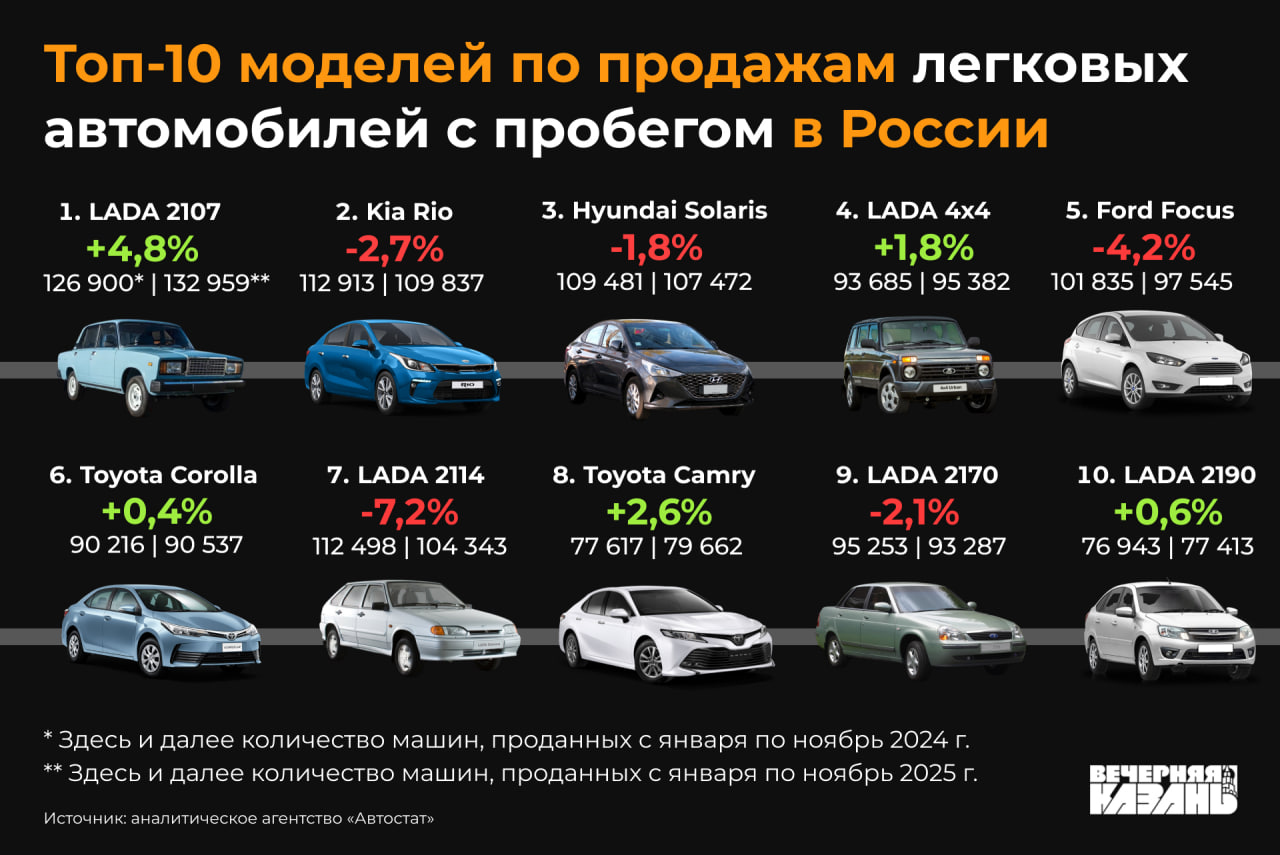 Среди брендов все так же лидирует LADA. По данным на 1 декабря, в республике было продано 48 473 подержанные машины этой марки. По сравнению с прошлым годом реализация даже чуть подросла: на 3,7%. В стране в целом вторую позицию в марочном рейтинге сохранила Toyota. На третьем и четвертом местах «корейцы» Kia и Hyundai, а замыкает пятерку лидеров Volkswagen. В десятке самых продаваемых авто также хорошо знакомые бренды Nissan, Chevrolet, BMW, Honda и Renault.