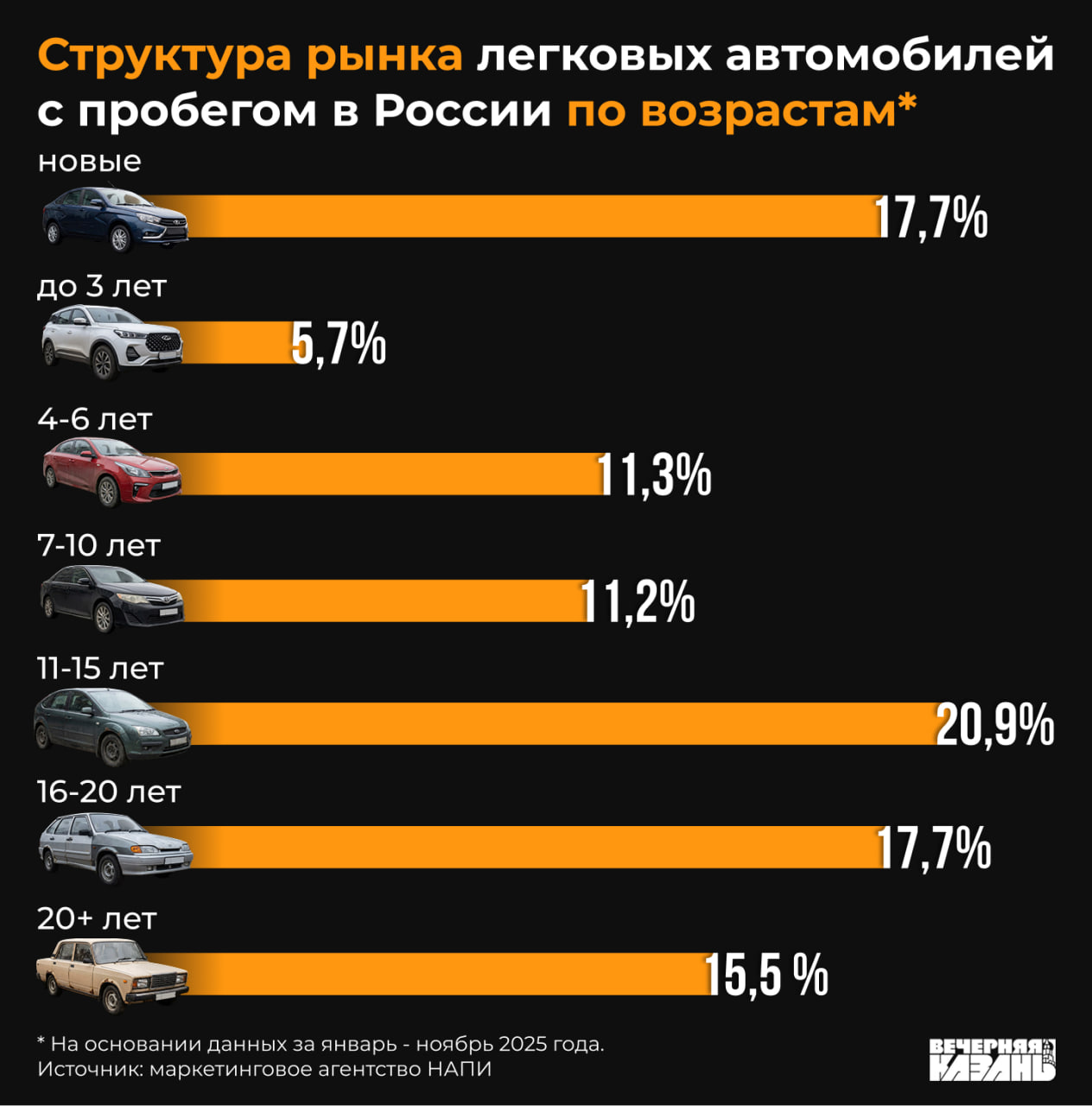 Больше всего, как и годом ранее, обращает внимание глава НАПИ, в 2025-м продавались машины возраста 11—15 лет (с динамикой к 11 месяцам прошлого года в 3,5%). В январе — ноябре на них пришлась четверть рынка. В то же время по сравнению с аналогичным периодом прошлого года выросли продажи автомобилей старше 20 лет — на 8,8%. Машины возрастом 4—6 лет тоже покупали чаще, но совсем незначительно: на 2,3%.