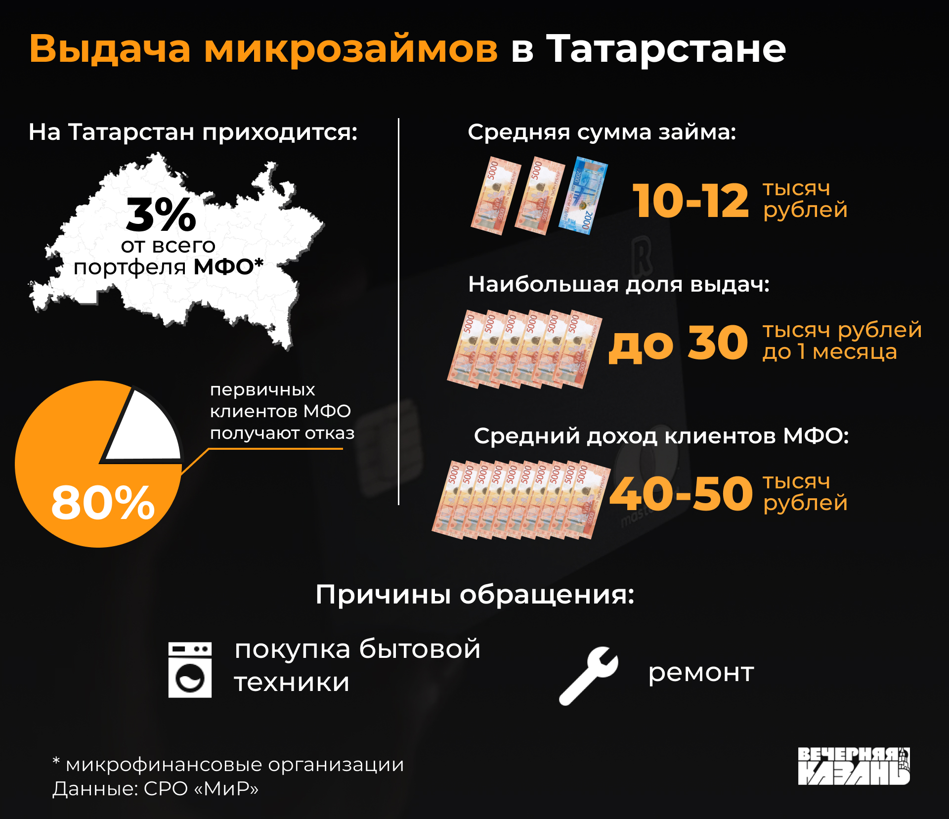 В пресс-службе СРО «МиР», объединяющей ведущих участников российского микрофинансового рынка, нашему изданию сообщили, что на Татарстан приходится около 3% от всего портфеля МФО. Республика традиционно входит в топ-10 по уровню спроса населения на заемные средства.