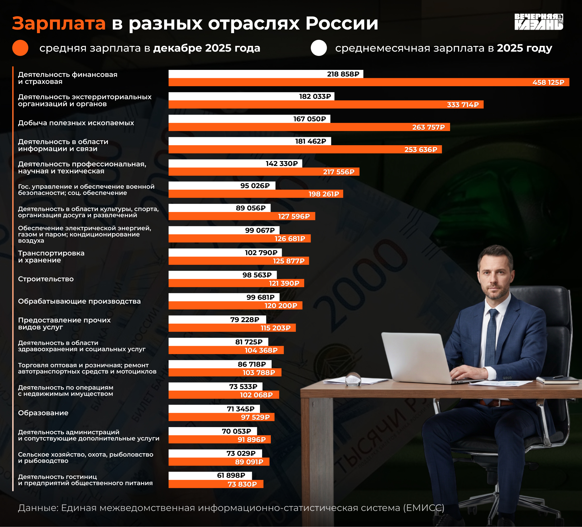 Размер номинальной зарплаты сильно отличается в зависимости от отрасли. Самые высокие выплаты получили сотрудники, занятые в сфере финансов и страхования: в декабре их средний заработок составил 458,1 тысячи рублей. На втором месте оказались экстерриториальные организации (организации и органы, которые не подпадают под действия законодательства государства, на территории которого находятся, например, российские представительства в других странах. — «ВК»), в декабре сотрудники, связанные с этой сферой, получили в среднем 333,7 тысячи рублей. Щедрые выплаты в декабре получили и в отрасли добычи полезных ископаемых — 263,7 тысячи рублей.