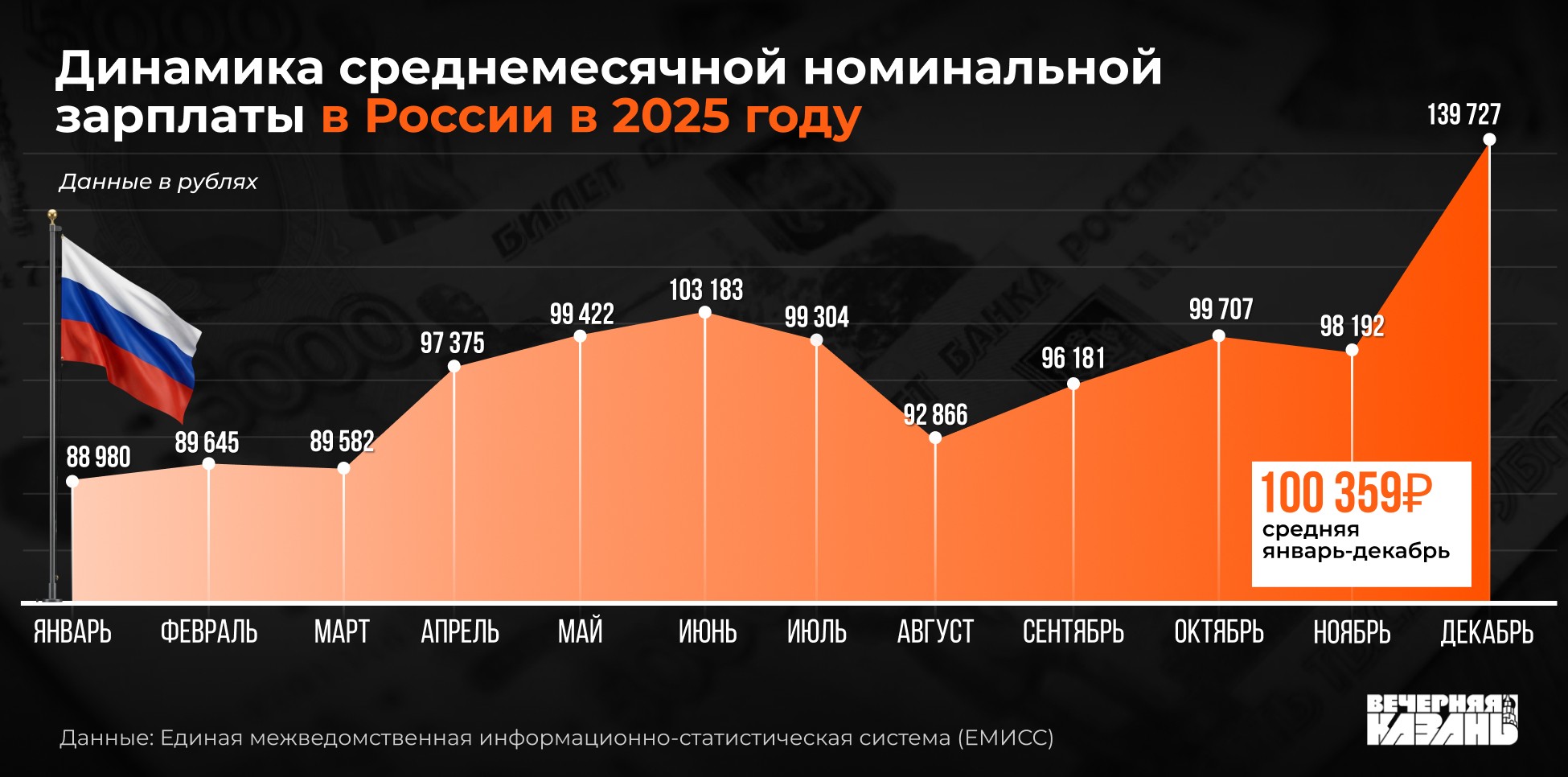 В декабре 2025 года средняя зарплата по России достигла 139,7 тысячи рублей. За месяц показатель резко вырос более чем на 40 тысяч — еще в ноябре он составлял 98,2 тысячи рублей. Это следует из данных Единой межведомственной информационно-статистической системы (ЕМИСС).