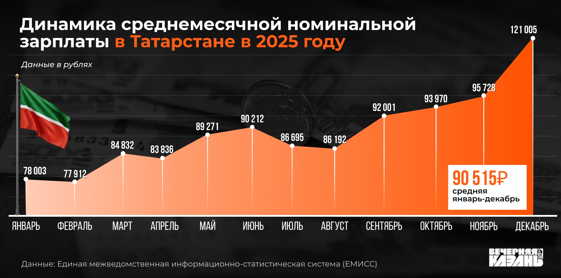 Показатель средней зарплаты в Татарстане лишь на 18 тысяч не дотягивает до общероссийского. В декабре средний заработок жителя республики, по данным ЕМИСС, составлял 121 тысячу рублей. При этом в среднем по 2025 году он находился на уровне 90,5 тысячи рублей.