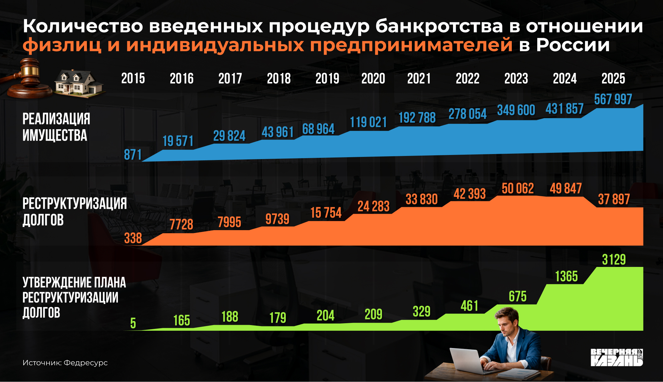 — В прошлом году потерпели крах 568 тысяч физлиц и индивидуальных предпринимателей, что на 31,5% больше, чем в 2024 году. Хотя последние три года темпы роста числа разорившихся среди этих категорий составляли 20—30%. А в первые пять лет они ежегодно достигали 50—70%.