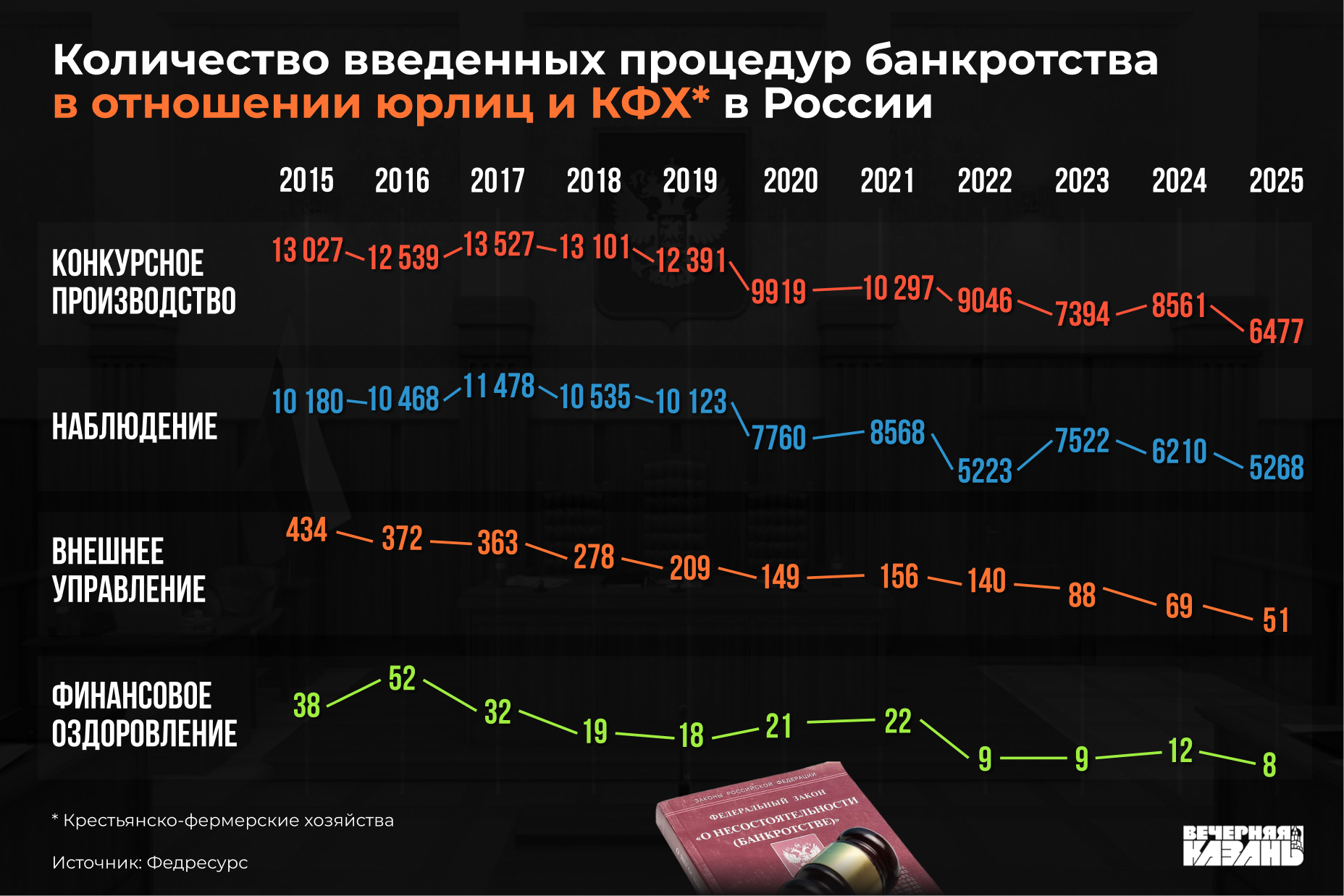 — Количество процедур несостоятельности компаний в России в 2025 году снизилось до исторического минимума — 6,5 тысячи. По словам руководителя Федресурса Алексея Юхнина, это тенденция последних семи лет. С корпоративными банкротствами действительно обстоит все так хорошо?