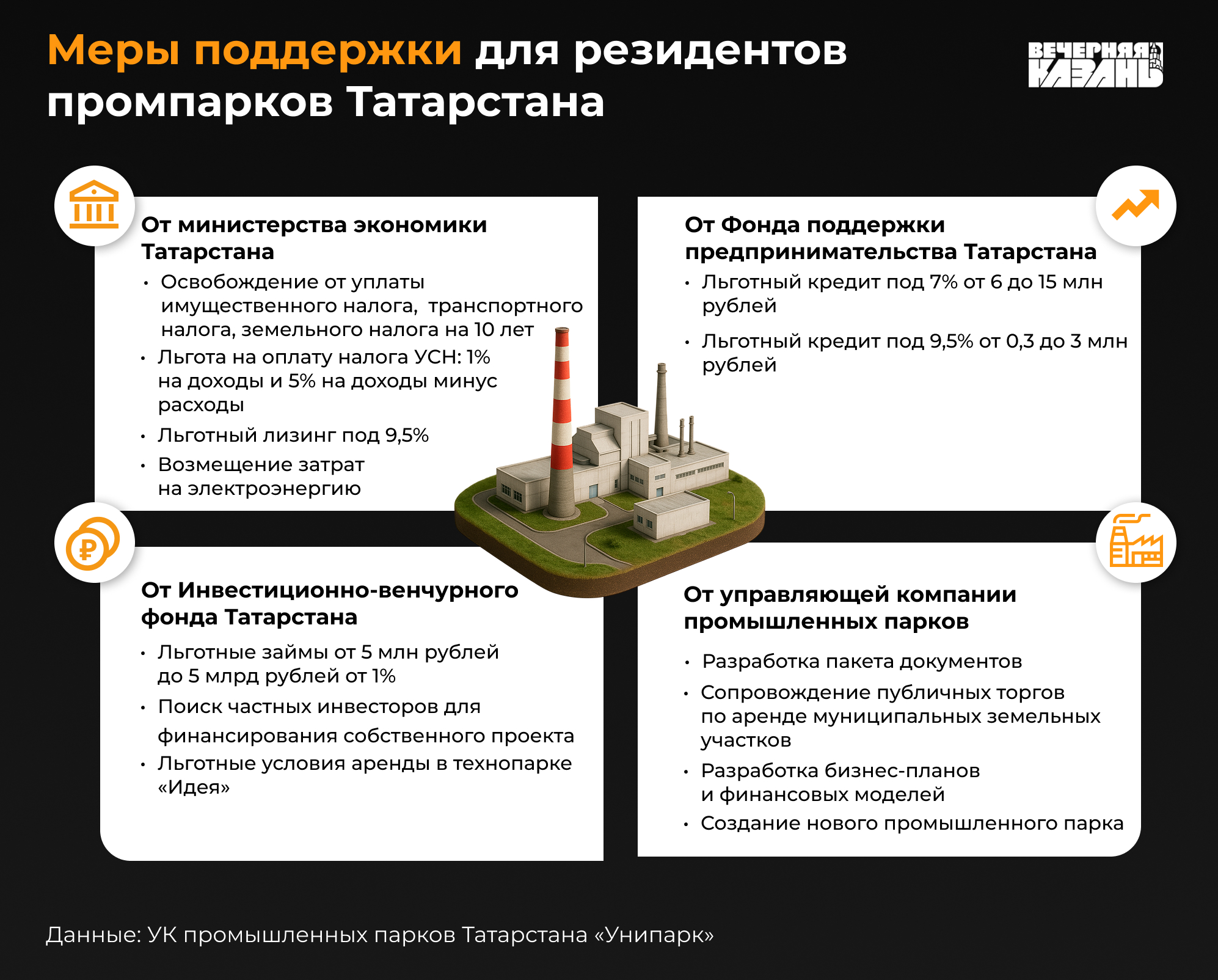 В Минэкономики Татарстана нашему изданию сообщили, что на данный момент производимая резидентами продукция составляет около 10,5% от всего промышленного производства республики. За последние три года в Татарстане новые промышленные парки появились в Высокогорском, Зеленодольском. Нижнекамском и Пестречинском муниципальных районах Татарстана. Для повышения заполняемости промпарков в республике разработали меры поддержки, предоставляющие налоговые льготы. Пользоваться ими могут только резиденты и управляющие компании, которые работают на территориях аккредитованных промышленных парков с низким уровнем заполняемости и заключившие соглашение с министерством экономики Татарстана.