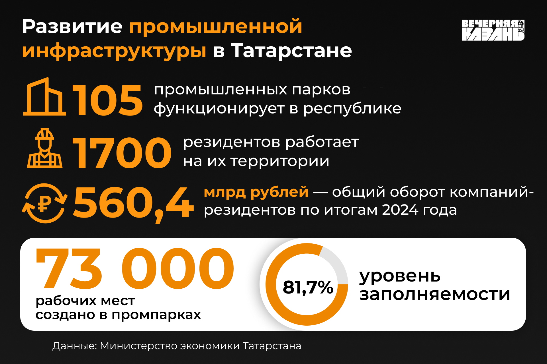 На сегодняшний день в Татарстане функционируют 105 промышленных парков. Согласно данным министерства экономики республики, за 2024 год предприятия-резиденты заработали 560,5 миллиарда рублей. По итогам первого полугодия 2025 года они заполнены почти на 81,7%. Наибольшей популярностью среди предприятий пользуются промпарки города Набережные Челны, Зеленодольского, Кукморского и Менделеевского муниципального районов.