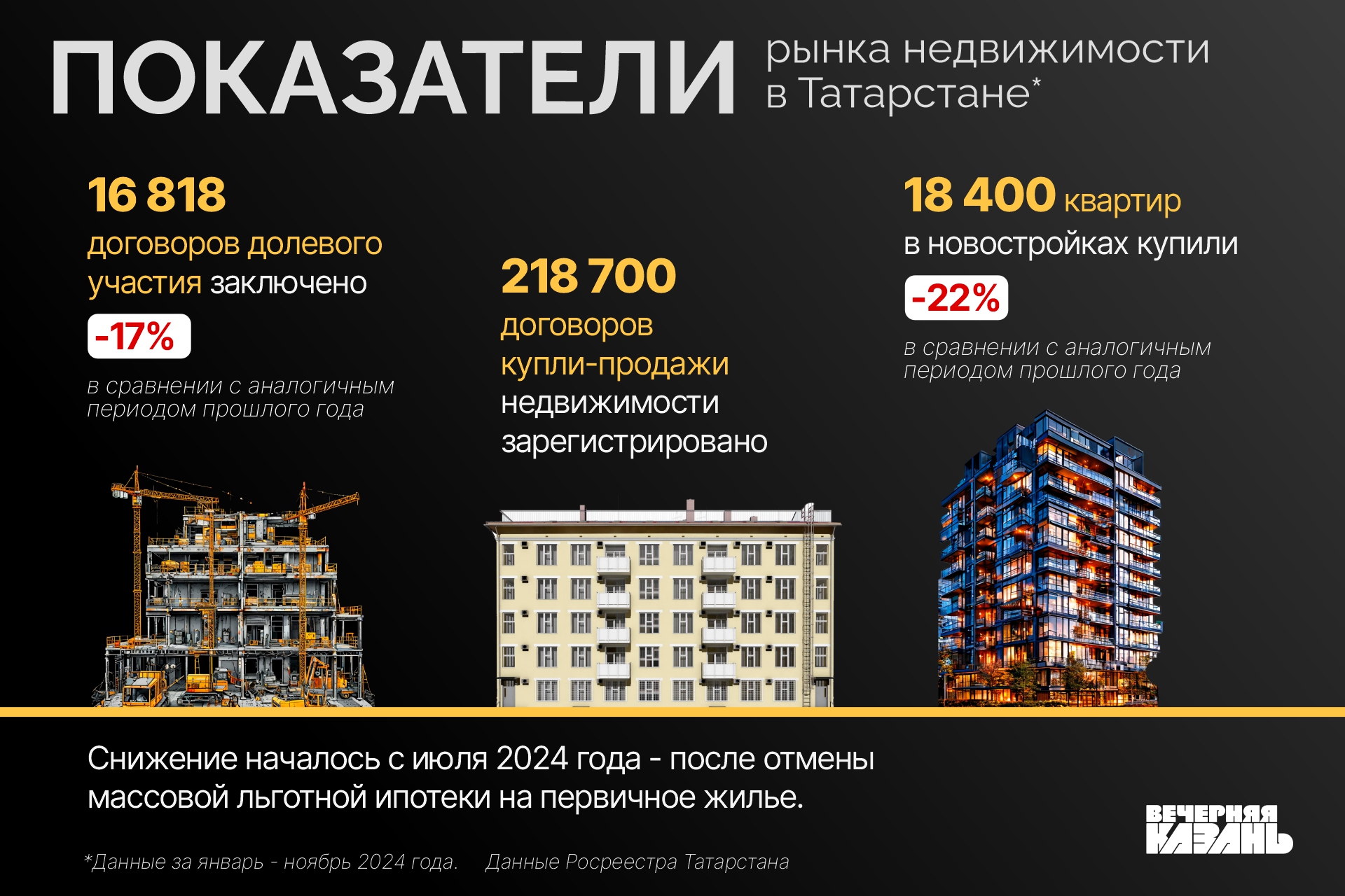 Отмена «массовой» льготной ипотеки больно ударила по рынку новостроек. В июле 2024 года в Татарстане резко снизилось количество заключаемых сделок на первичном рынке: продали всего 1,2 тысячи новых квартир, сообщил Росреестр республики. Всего с января по ноябрь спрос на новостройки снизился на 22%. Количество сделок на первичном рынке за первые 11 месяцев 2024 составило 18,4 тысячи, в то время как годом ранее в республике реализовали 23,5 тысячи квартир. На 17% снизилось и количество заключенных договоров долевого участия.