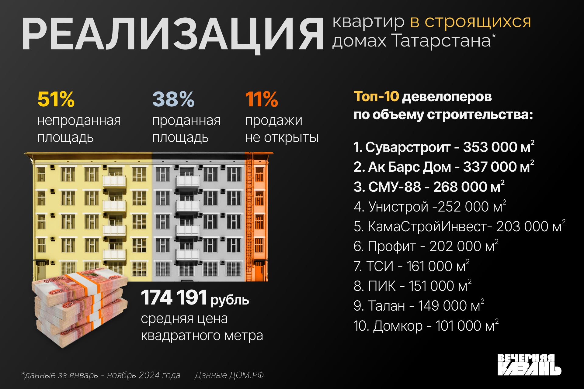 Согласно данным «Дом.РФ», средняя стоимость квадратного метра в строящихся домах в Татарстане составила 174,2 тысячи рублей. По состоянию на ноябрь в республике продали 34% квартир в новостройках, нераспроданными же осталось чуть меньше половины, а именно 45% жилья.