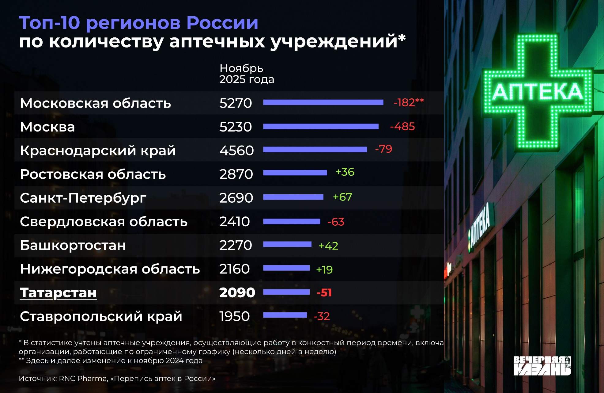 Доля крупных сетевых аптек в стране превысила 88 %. Между тем препараты все дорожают — в нашей республике особенно, а потребители все больше экономят. В 2025 году татарстанцы потратили в аптеках 41 млрд рублей.