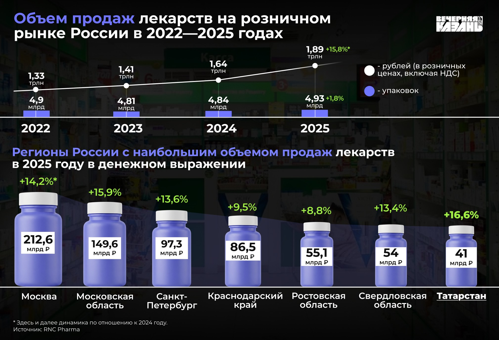 Собеседник издания подчеркнул, что инфляция в Татарстане в 2025 году была выше, чем в среднем по стране. Цены на лекарства в аптеках здесь по данным RNC Pharma выросли на 9,1% по отношению к 2024 году. Правда, говорит он, это меньше, чем было в 2024 году относительно 2023-го года (10,7%).