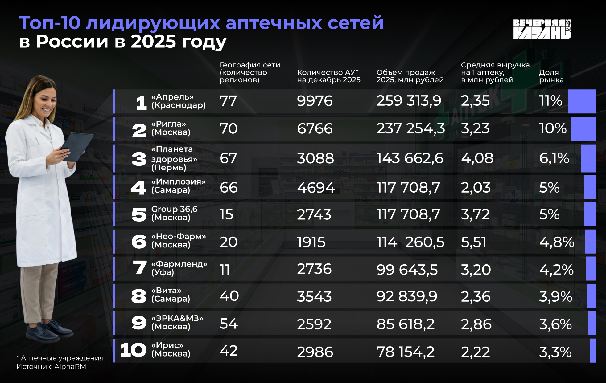 Таковы данные рейтинга компании AlphaRM. То есть лидеры российского фармретейла удержали свои позиции. Интересно, что сети «Фармленд» (родом из Уфы) и «Вита» (это Самара), чьи аптеки столь распространены в Татарстане, в общероссийском рейтинге находятся лишь на 7 и 8 позициях. У них своя стратегия: активность в регионах.