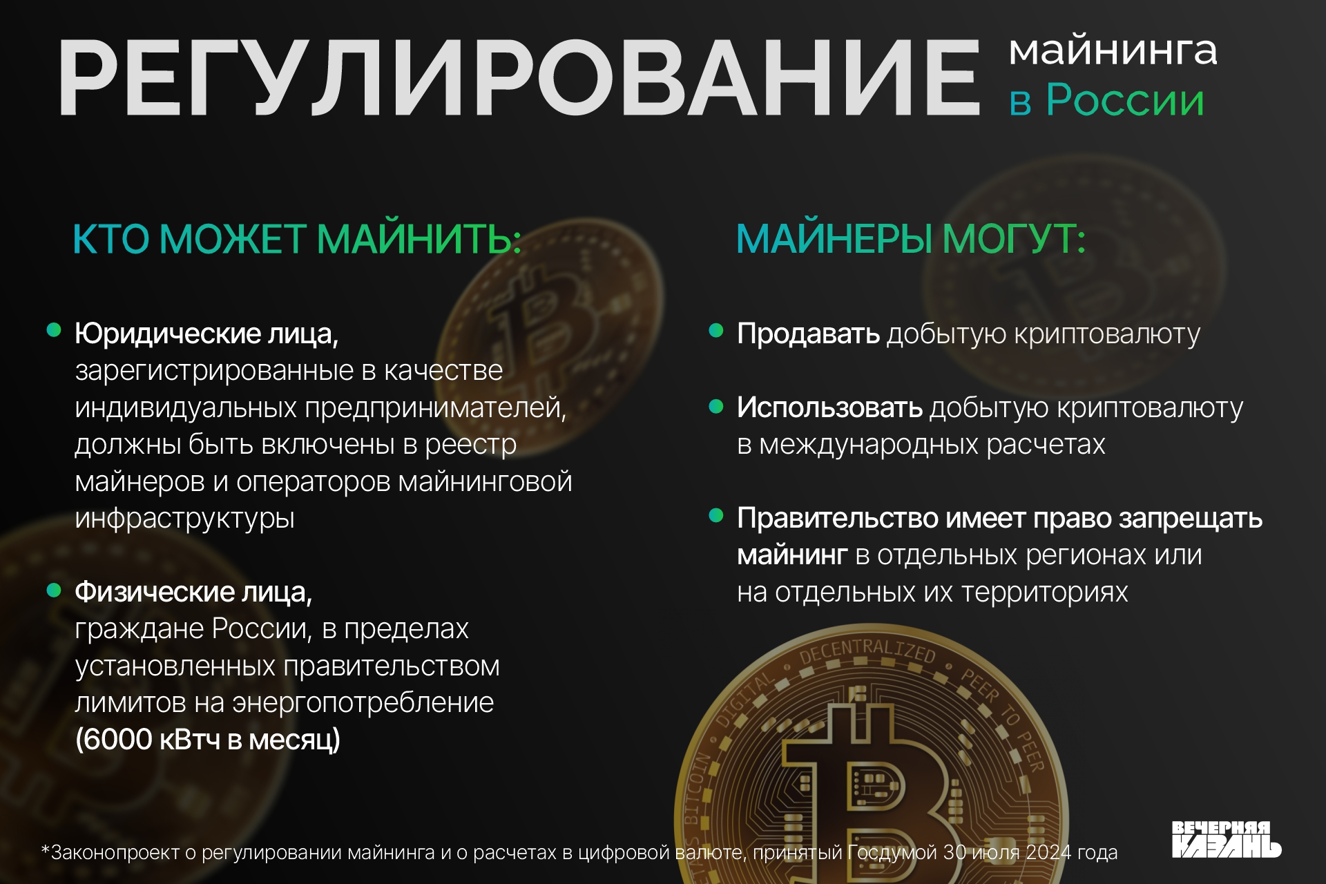 С 1 ноября юридические лица и индивидуальные предприниматели могут добывать криптовалюту: для этого нужно зарегистрироваться в специальном реестре ФНС. Майнить могут и физические лица без регистрации, но в пределах установленных норм. Если показатель в 6 тысяч киловатт-часов в месяц окажется превышен, то продолжать майнить получится только после регистрации в качестве индивидуального предпринимателя и включения в реестр. За тем, чтобы операции через криптокошельки не были связаны с отмыванием доходов или финансированием терроризма, следит Росфинмониторинг.