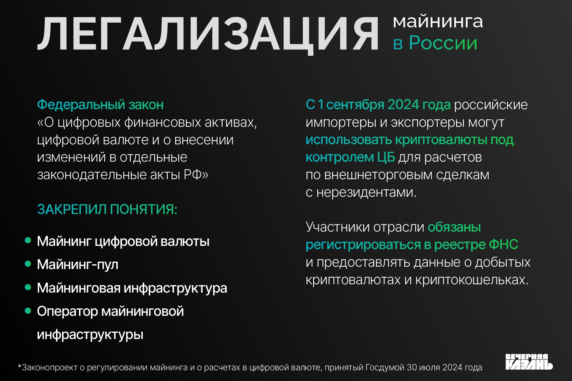 В России вступили в силу новые законы, легализующие майнинг. Татарстан активно поддерживает инновационные начинания. Однако развитие отрасли тормозит сырое законодательство и дорогие тарифы на электроэнергию.