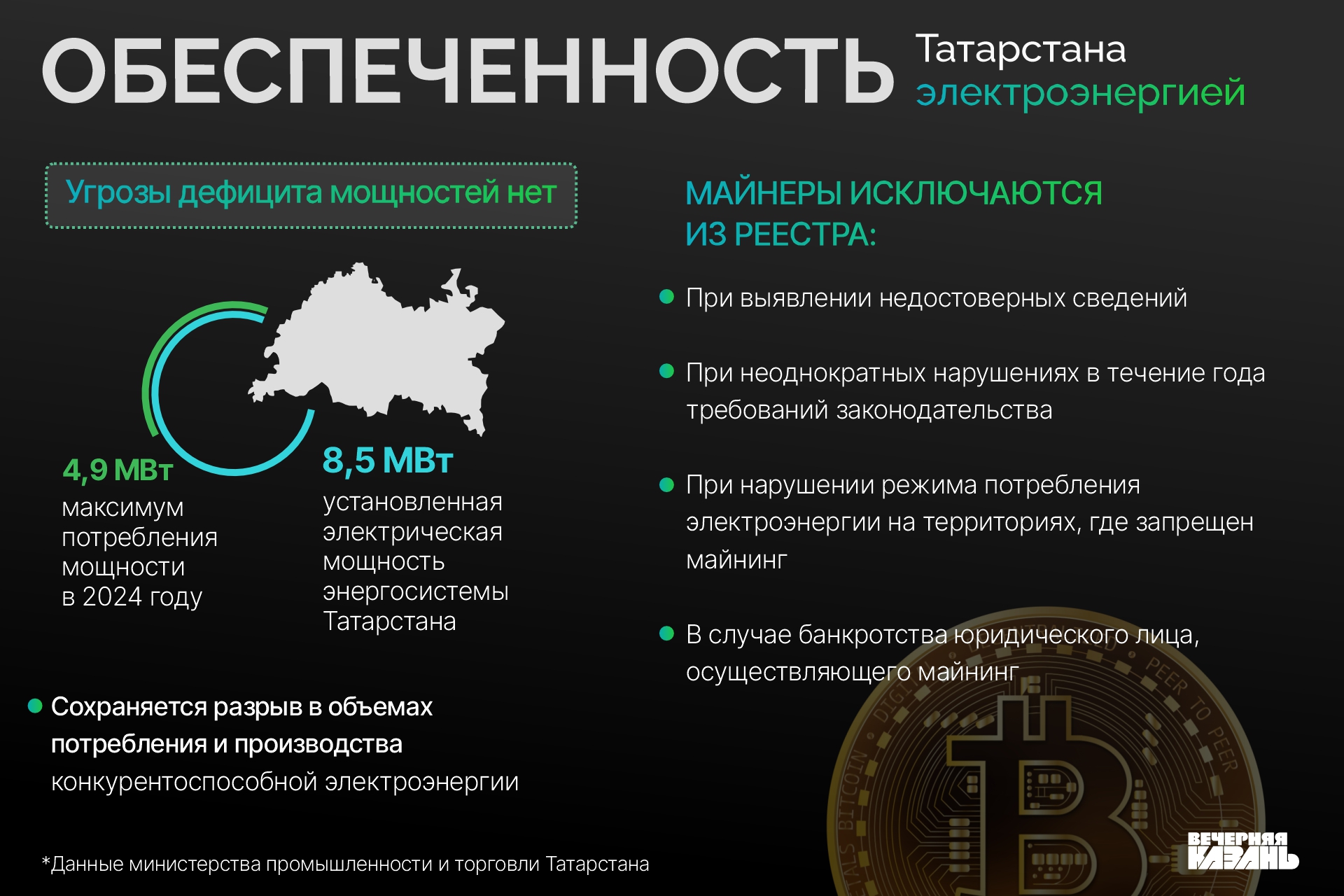 Согласно данным министерства промышленности и торговли Татарстана, в республике нет угрозы дефицита мощностей. В Минпромторге республики заявили, что вопрос развития майнинга находится на контроле у ведомства.