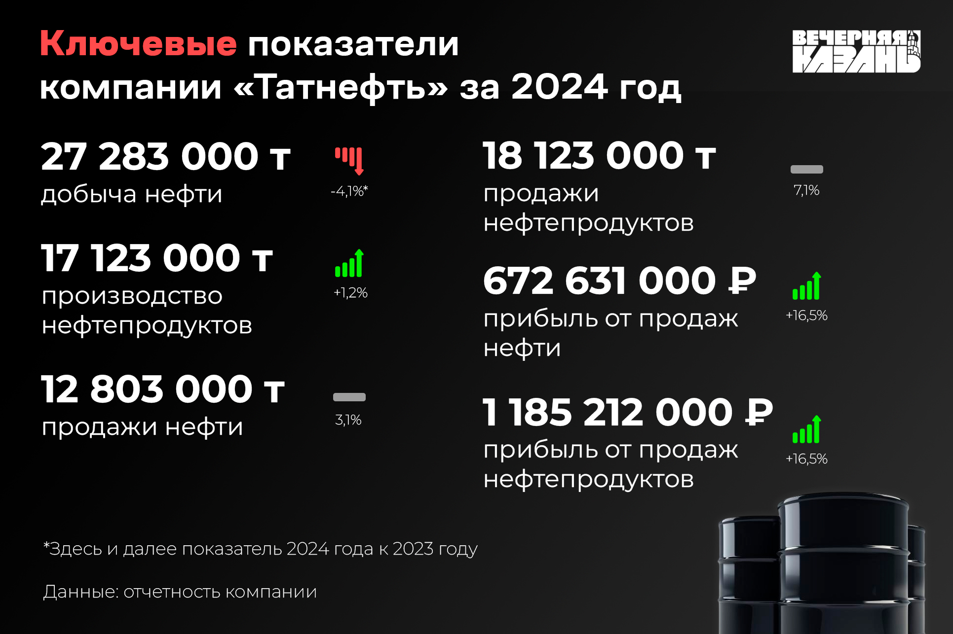 Из негативных моментов — в 2024 году Татнефть снизила добычу нефти на 4%, до 27,283 миллиона тонн, при этом среднесуточная добыча составила 531 тысячу баррелей (в 2023 году показатель равнялся 555 тысячам баррелей в сутки). Добыча газа сократилась на 5%, до 871 миллиона кубометров. Производство нефтепродуктов, наоборот, увеличилось на 1,2%, до 17,12 миллиона тонн, хотя показатель переработки нефти уменьшился на 0,3%, составив 341 тысячу баррелей в сутки. Производство газопродуктов снизилось на 12%, до 955 тысяч тонн.