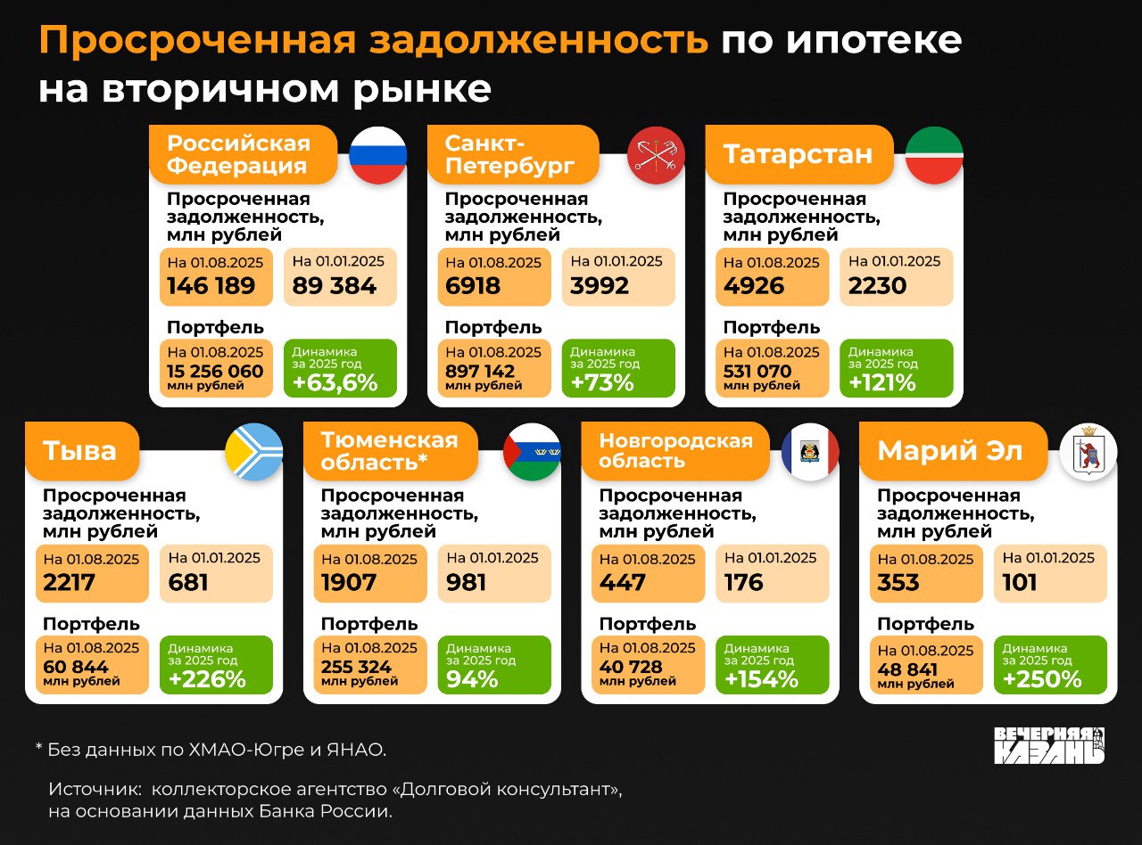К началу августа задолженность по ипотечным платежам на вторичном рынке жилья в стране превысила 146 миллиардов рублей, увеличившись с января в 1,7 раза. Такие данные приводит коллекторское агентство «Долговой Консультант», опираясь на информацию ЦБ. Речь идет о неисполнении заемщиками обязательств на протяжении более чем трех месяцев. Таким образом, с начала года набежало 57 миллиардов рублей.