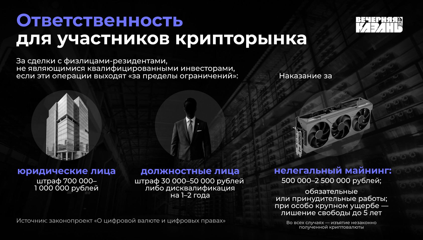 Легально торговать виртуальными деньгами разрешат только на российских биржах. При условии, что активы удовлетворят жёстким критериям: рыночная капитализация в несколько триллионов рублей и не менее чем пятилетняя история публичных торгов. А нелегальная добыча может обернуться и тюремным заключением.