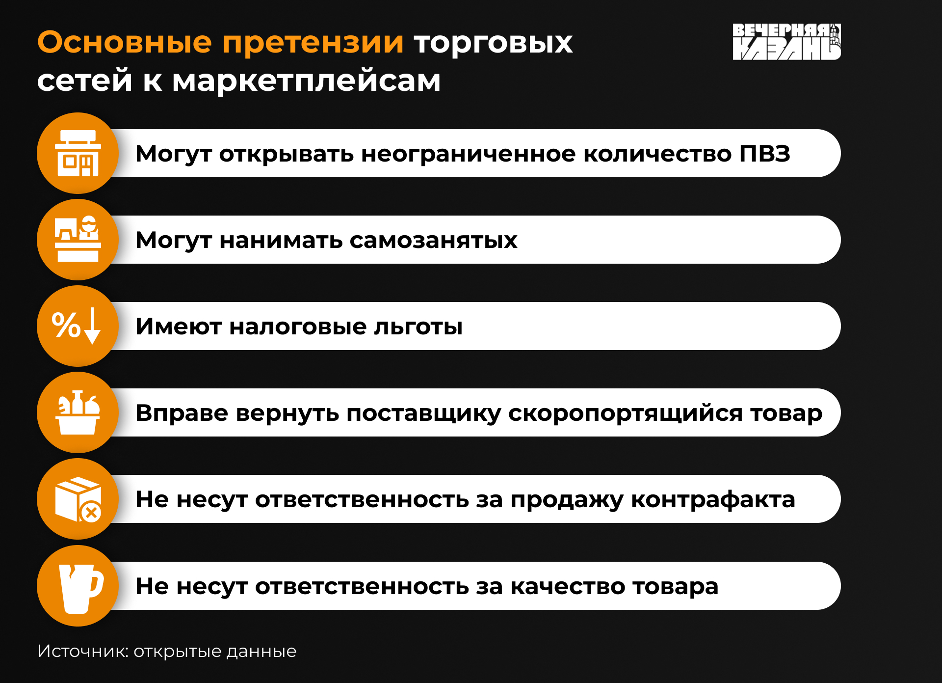 Представители татарстанской традиционной торговли так же, как и их российские коллеги, считают, что маркетплейсы находятся в более выигрышной ситуации. На круглом столе в Торгово-промышленной палате летом этого года, посвященном третьей волне маркировки продукции легкой промышленности, они возмущались в том числе и по этому поводу и требовали принять меры.