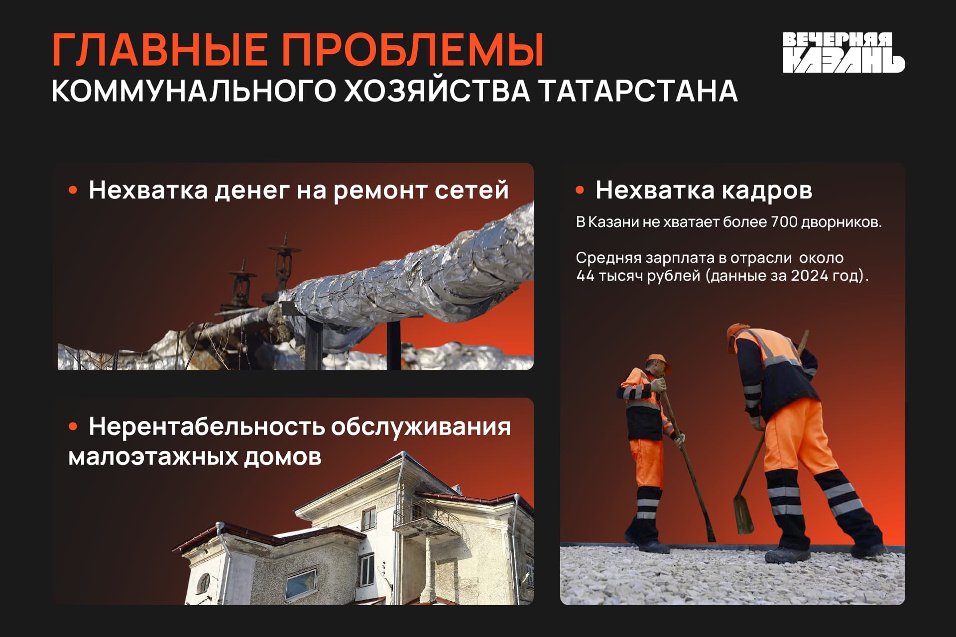 «Какие в ЖКХ проблемы? Вся отрасль — одна большая проблема», — лаконично характеризует состояние дел один из опрошенных изданием экспертов. Говорят об этом и цифры: 200–300 миллиардов — такая сумма, по оценке раиса Татарстана Рустама Минниханова, нужна для решения коммунальных проблем в Татарстане. А мэр Казани Ильсур Метшин ранее и вовсе сравнивал износ сетей в российских городах с «зудящей занозой». В сентябре 2024 года руководство республики объявило о запуске программы модернизации жилищно-коммунальной инфраструктуры на 10 миллиардов рублей. Однако этой суммы явно недостаточно для решения всех проблем, вдобавок коммунальная отрасль столкнулась с серьёзным кадровым дефицитом, что ещё больше усугубило ситуацию.