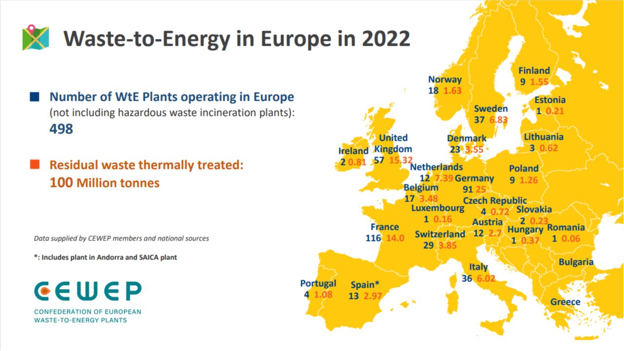 По данным CEWEP (Confederation of European Waste-to-Energy Plants), только в Европе, по последним опубликованным подсчетам, действует порядка 500 заводов по энергетической утилизации отходов. Всего в мире функционируют 2500 аналогичных предприятий. В Швейцарии, Швеции, Австрии, Нидерландах, а также Японии на нее приходится около 91%.