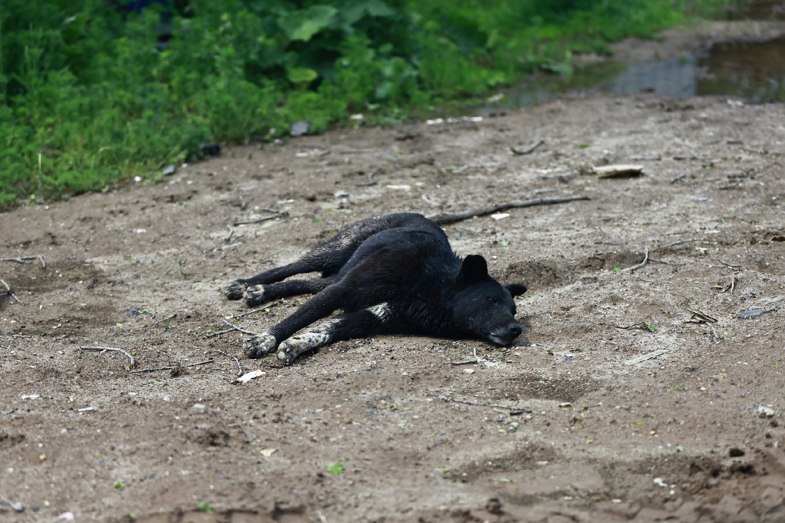 Ещё с десяток грузовых машин стояли у въезда на огромную свалку, откуда шел токсичный серый дым. Открыв окна для того, чтобы сделать пару фотографий, мы впустили в салон автомобиля очень неприятный запах горелого мусора, который моментально оседает на одежде и волосах. Спустя пятнадцать минут, проведенных здесь, можно почувствовать головокружение и тошноту. Плохо, по всей видимости, стало и собакам. Их мы заметили рядом с въездом. Четвероногие лежали, почти не двигаясь и не обращая внимания на проезжающие мимо машины.