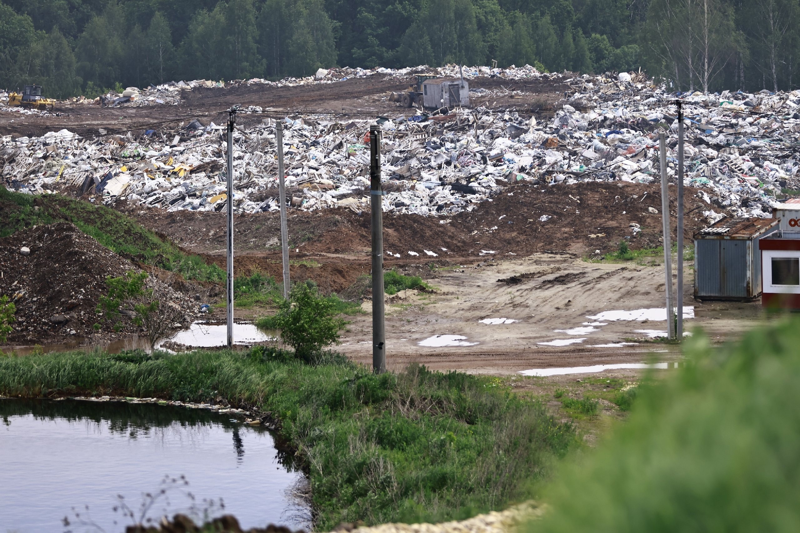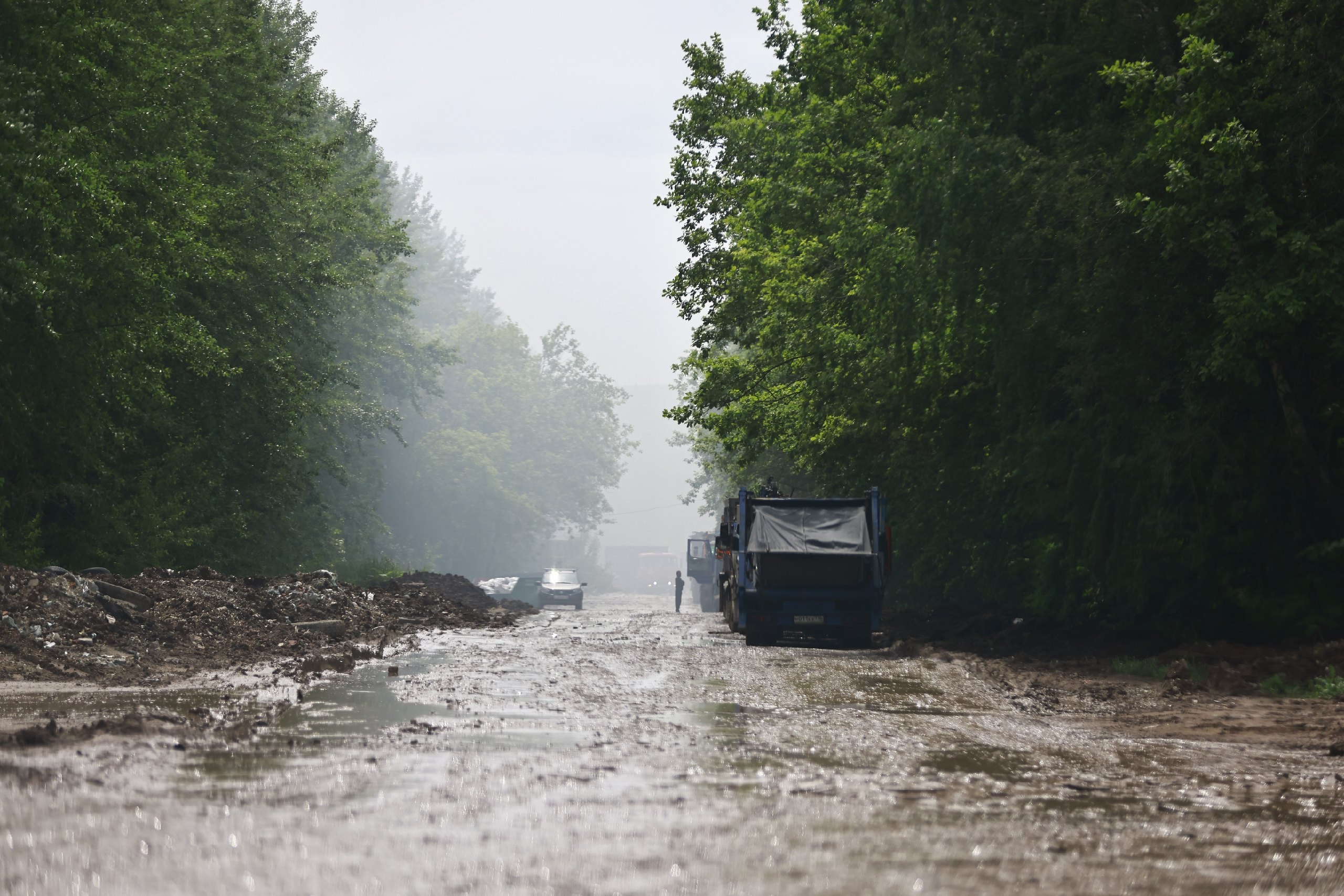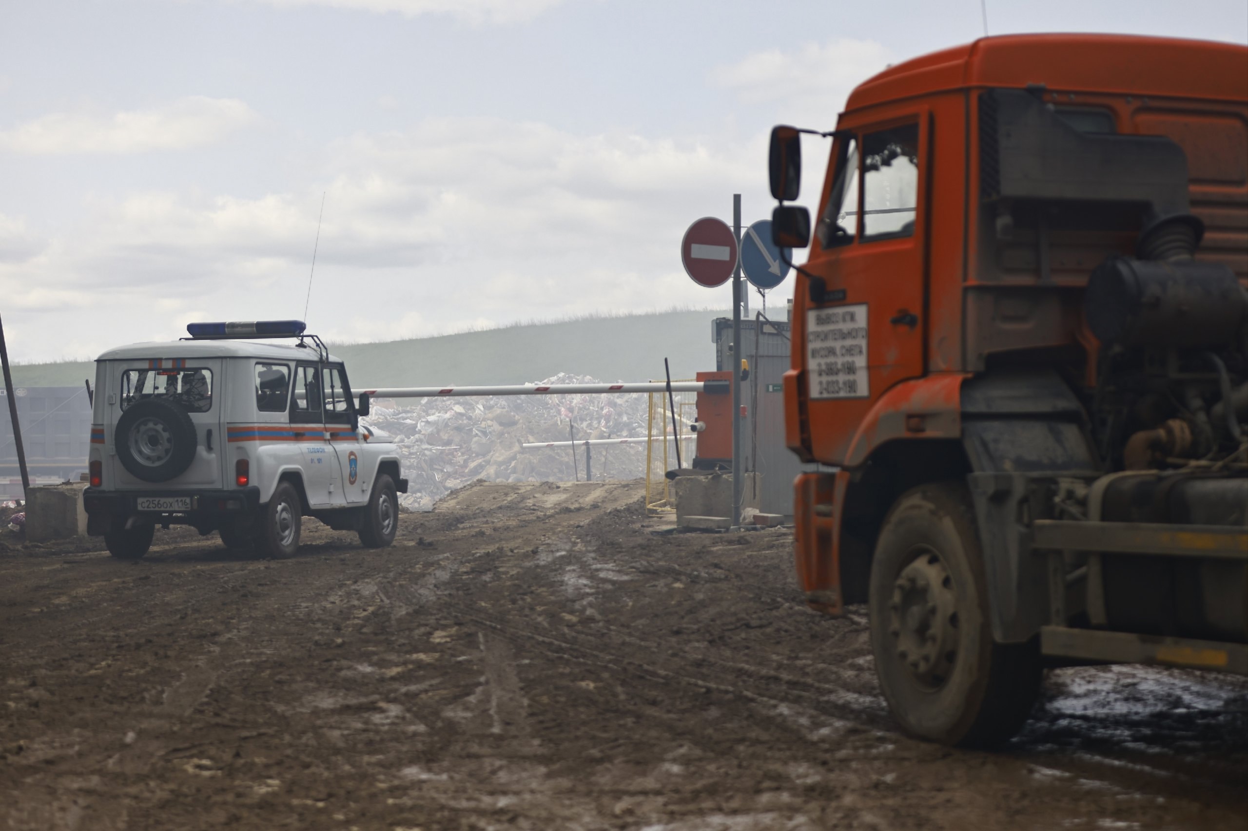 Смог был виден ещё на заезде к полигону твердых бытовых отходов, находящемуся неподалеку от жилого массива Самосырово. Оттуда выезжало не меньше пяти КАМАЗов, вывозящих строительный мусор. Из-за ливня путь до полигона осложнился: земля смешалась с грязью, а кое-где образовались большие лужи.