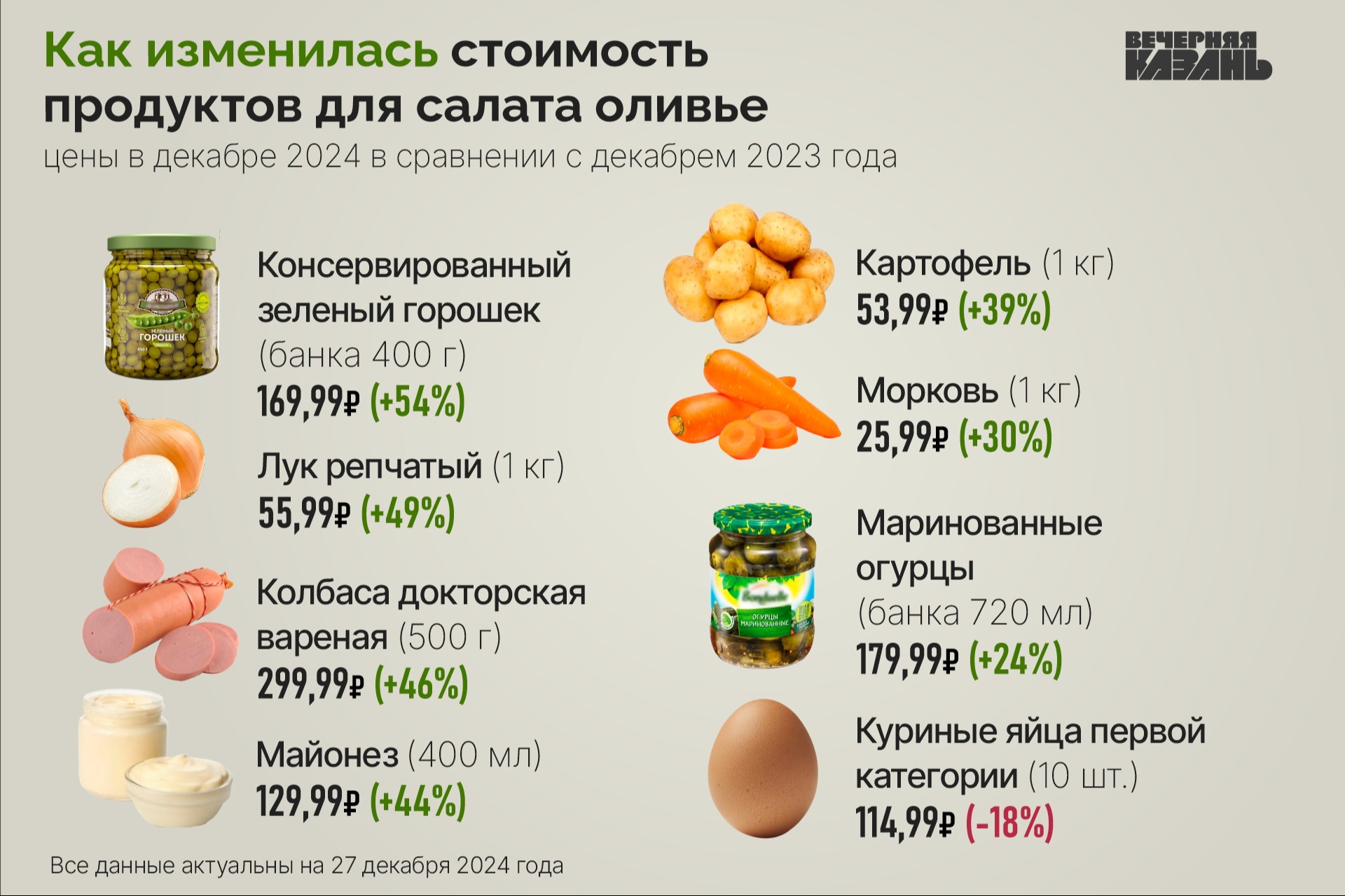 Больше остальных ингредиентов с прошлого года, по нашим подсчетам, подорожали картофель (+93%), консервированный зеленый горошек (+54%) и репчатый лук (+49%). Колбаса прибавила 46% стоимости, майонез — 44%, морковь — 30%, а маринованные огурцы — 24%. И только яйца, цены на которые будоражили рынок в прошлом году, на этот Новый год обойдутся дешевле на 18%.