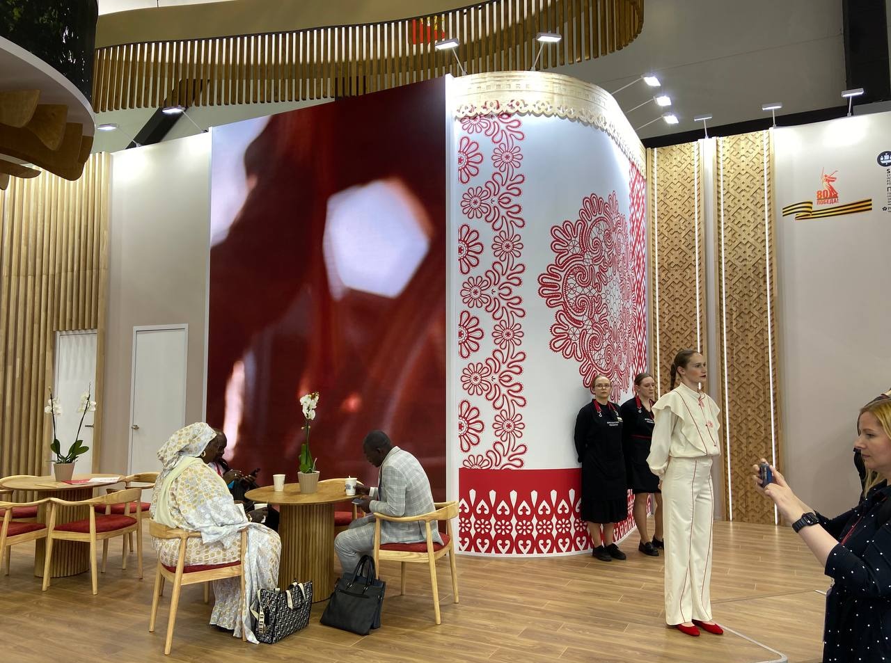 Значительную часть площадки форума занимает выставка достижений регионов страны. Найти экспозицию Татарстана не составило труда: он расположился на входе в выставочный павильон. В оформлении стенда использовали элементы, вдохновленные традиционными национальными украшениями, а гостей здесь встречают девушки в национальных костюмах. Услышав из динамиков хит Салавата Фатхетдинова «Мин яратам сине, Татарстан», корреспонденту «Вечерней Казани» показалось, что он никуда и не уезжал из республики.