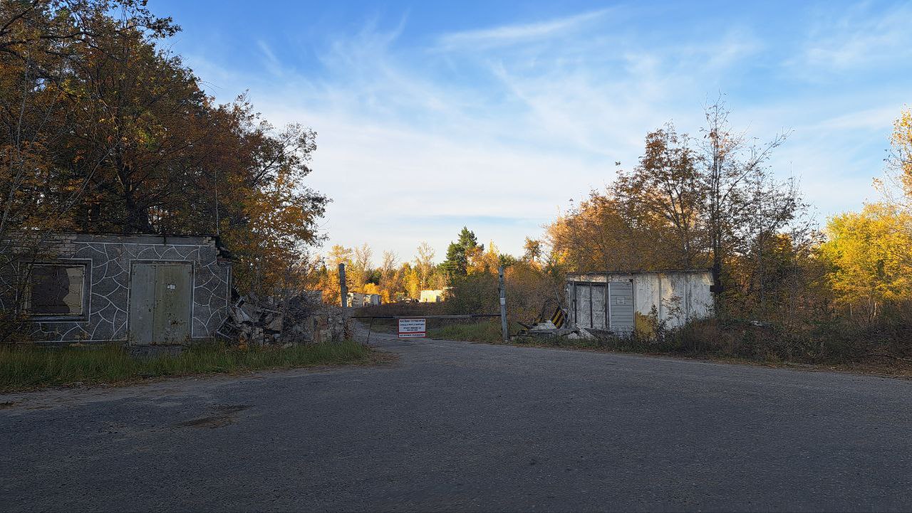 В лесу неподалеку от стройплощадки еще виднеются разрушенные здания, оставшиеся от военной части.