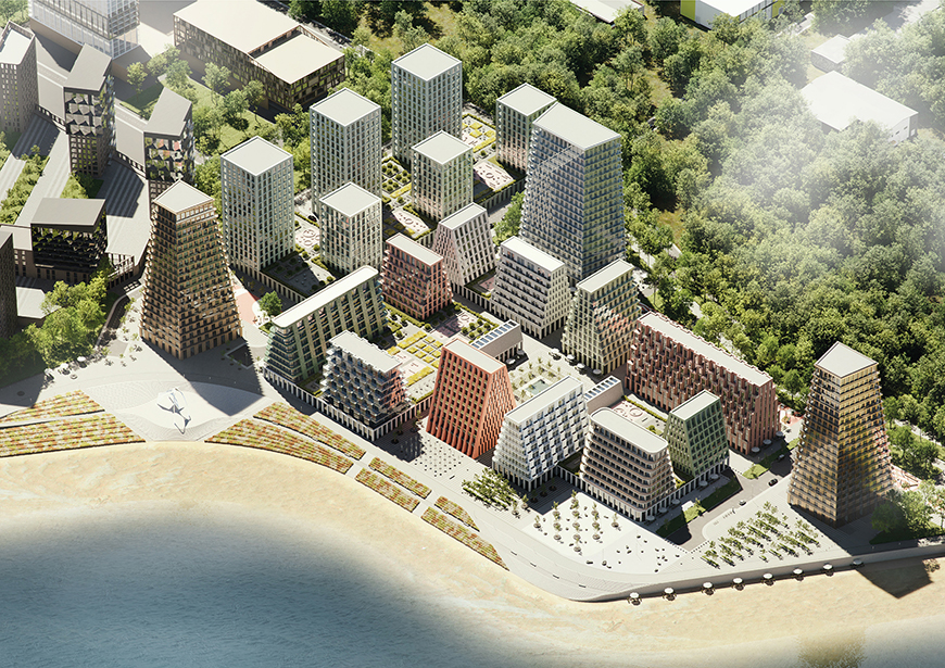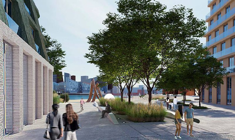 В центре территории главный архитектор видит появление высокого акцента, который станет деловым центром. Место планируют украсить уже имеющимися объектами инфраструктуры. Краны станут арт-объектами, напоминающими о глобальной истории этой промышленной зоны. Большое внимание уделят развитию парусного спорта. Появятся марина и детская парусная школа.