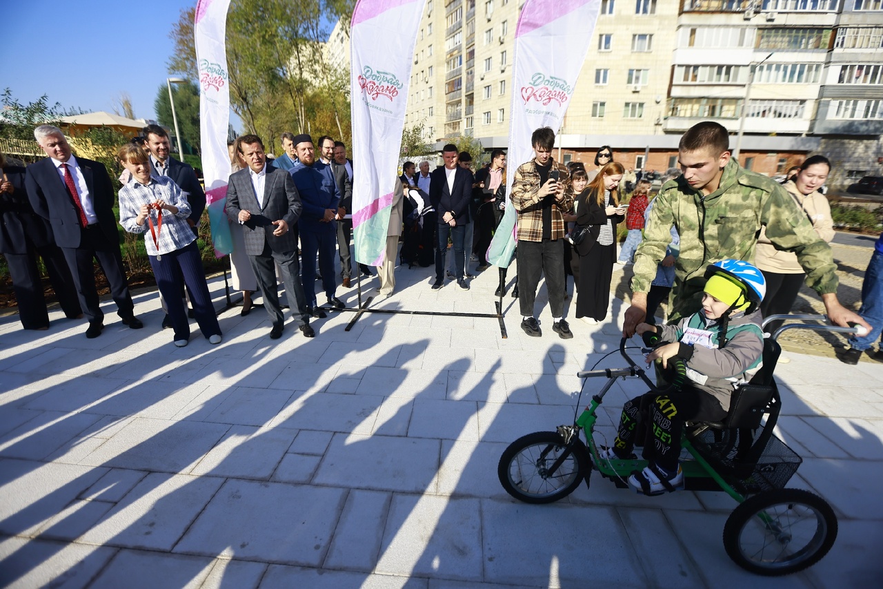 На открытие парка собрались жители ближайших домов. Программа началась с велозабега на специальных трёхколёсных велосипедах. В нем участвовали дети с ОВЗ, вместе с ними дистанцию проходили и парни в камуфляже — учащиеся из школы Левченко. По краям стоят школьники с плакатами, обычные прохожие и родные участников. Отличие забега от привычного: главное — не добраться первым, а преодолеть трассу.