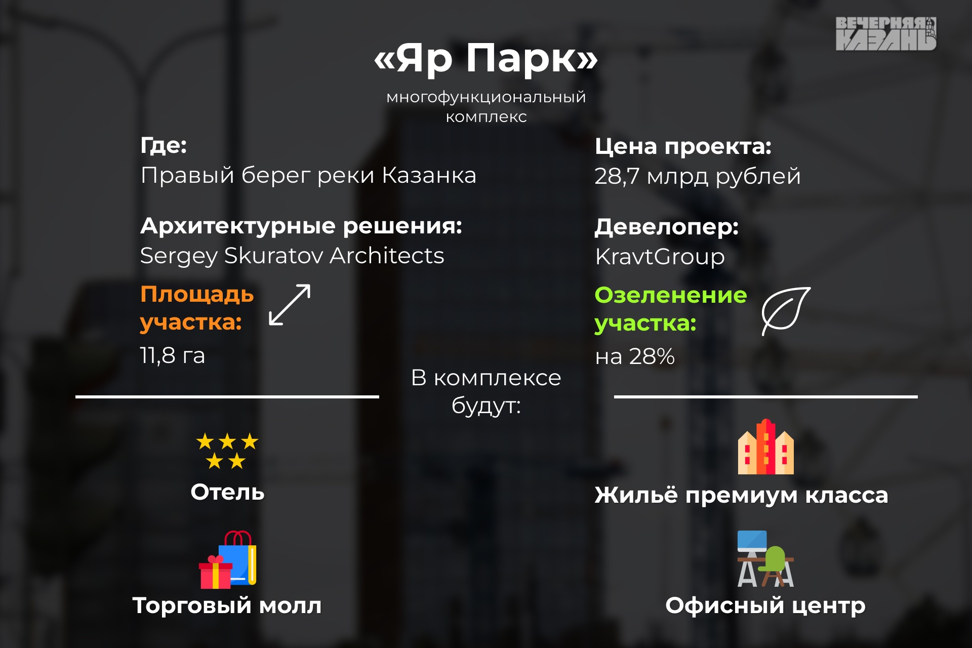Каков масштаб «Яр Парка»? По информации, предоставленной KravtGroup для «Вечерней Казани», общая площадь комплекса составит 11,8 гектара. Проект включает 13 корпусов, среди которых — пятизвездочный отель, десять корпусов апартаментов бизнес- и премиум-класса, современный офисный центр и торговый молл. Все здания объединит благоустроенная территория с пешеходными аллеями и зелеными парками — на озеленение отведено около 28 процентов от всей площади. «Яр Парк» задуман как живой центр города, где будут проходить фестивали, концерты и разнообразные городские события. Завершить проектирование комплекса планируется уже в 2025 году.