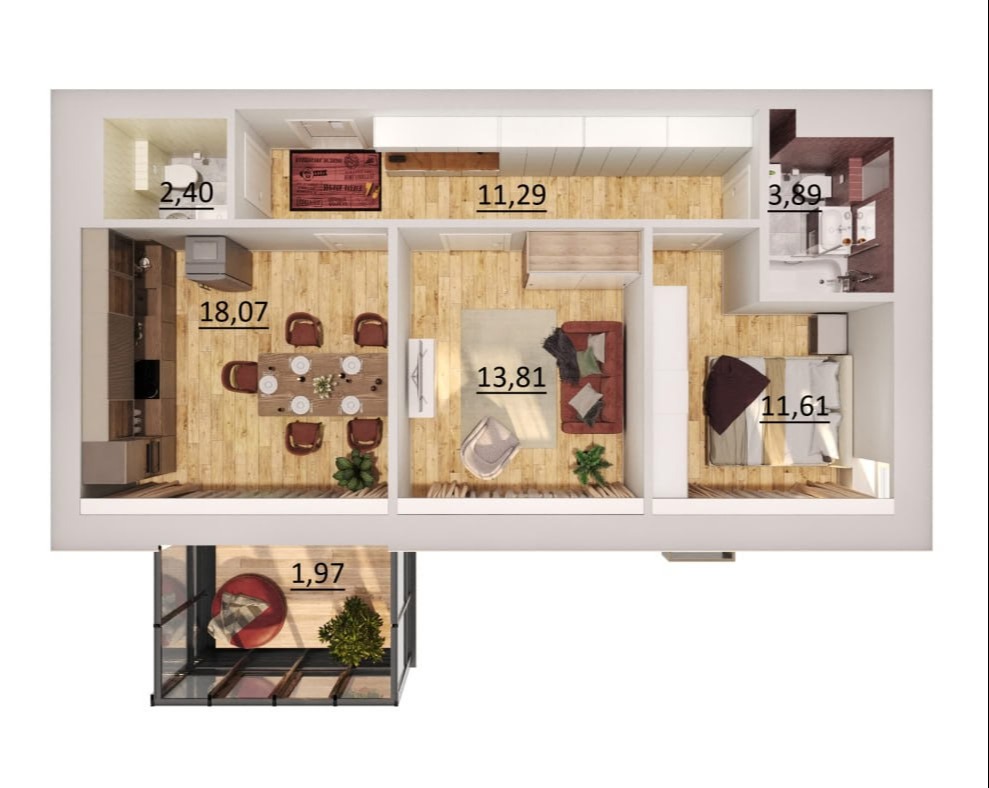 Двухкомнатная площадью 63,04 кв. м. продумана так, чтобы каждый чувствовал себя свободно. Две изолированные комнаты обеспечивают личное пространство, а кухня площадью 18,07 кв. м. с выходом на балкон словно приглашает начать утро с завтрака на свежем воздухе. Два санузла и просторная прихожая с местом под шкаф-купе делают жизнь в квартире особенно комфортной.