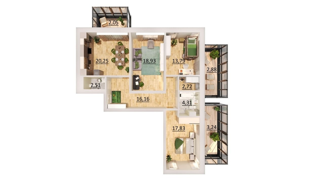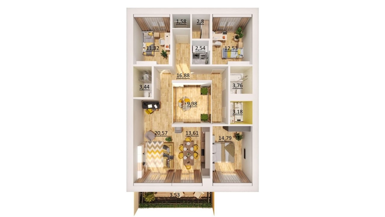 Квартира площадью 120,51 кв. м. — настоящая семейная резиденция. Просторная терраса для ужинов и встреч с друзьями, кухня-гостиная, три санузла, отдельная прачечная и гардеробная.