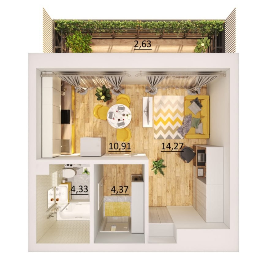 Квартира 36,51 кв. м. с террасой и кухней-гостиной — вариант, в который легко влюбиться. Простор позволяет организовать рабочее место для удаленной работы, а терраса станет личной зоной для отдыха и перезагрузки. Кухня спрятана в нише, чтобы не отвлекать на бытовые мелочи, а для вещей предусмотрено место под шкаф-купе.