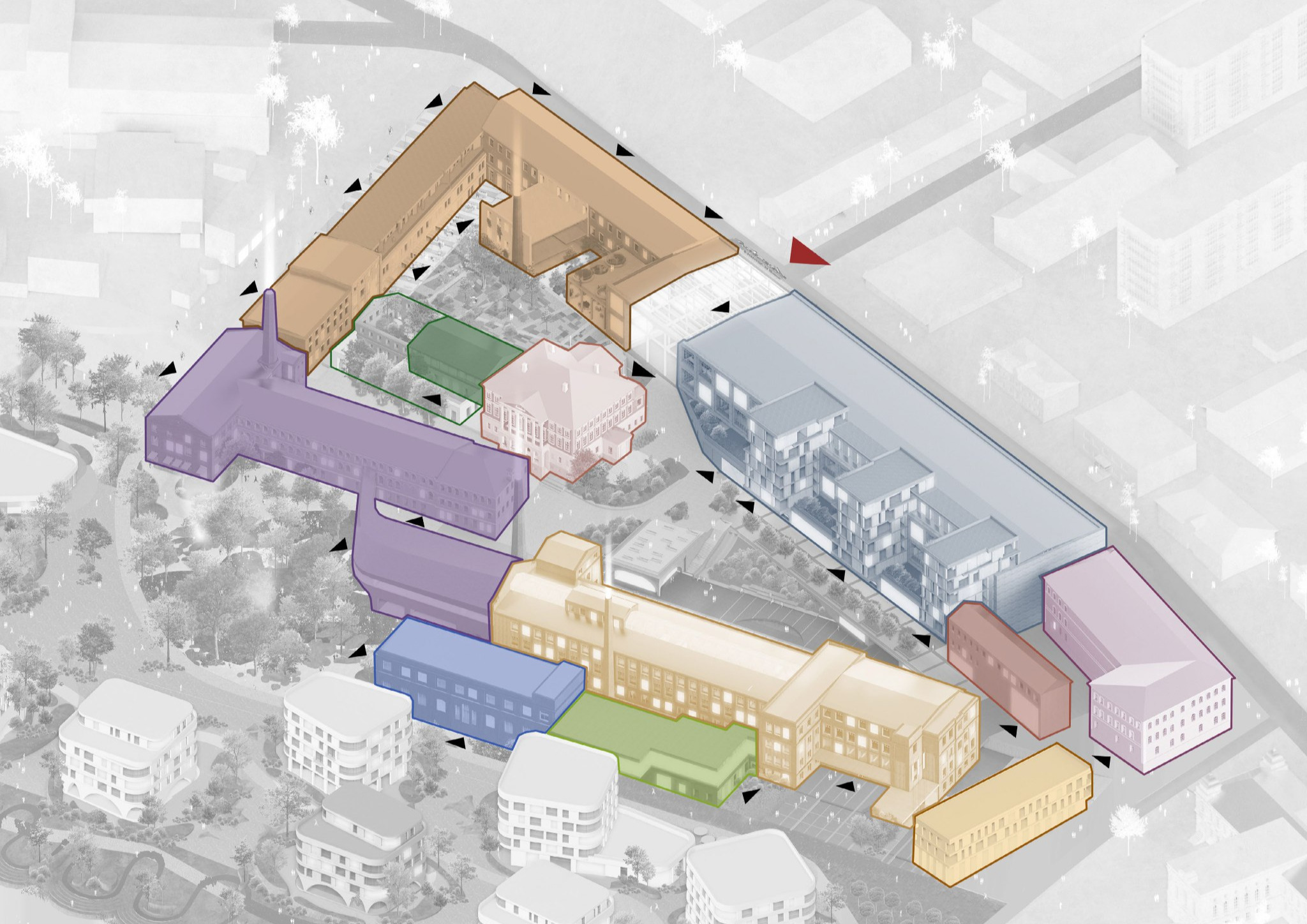 В здании ткацкой фабрики расположатся бутик-отель и апарт-комплекс. Напротив него ресторан и spa-центр - большой интересный комплекс с разными пространствами. Между ними внутренний двор.