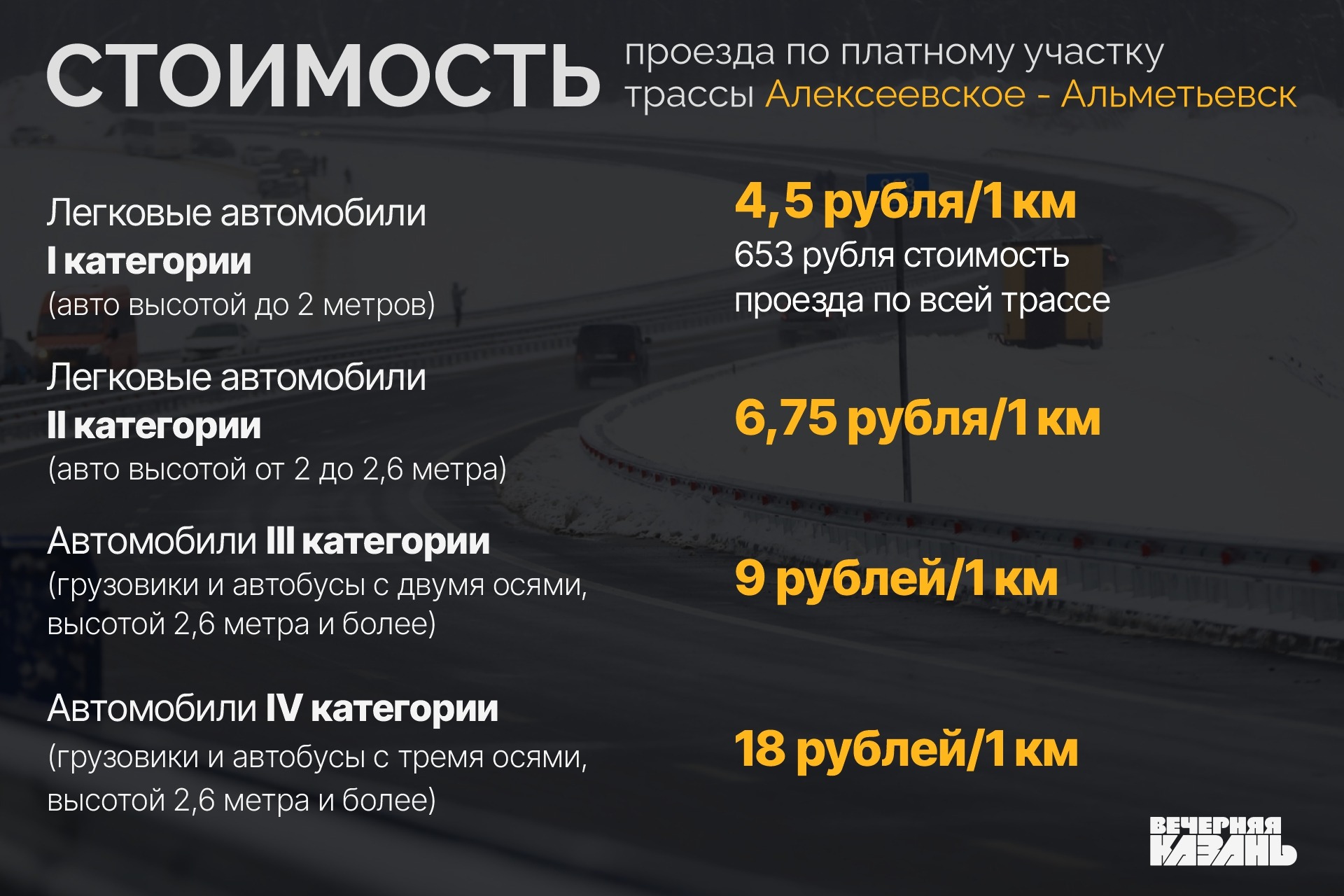 Платную часть Вознесенского тракта длиной около 8 километров – от проспекта Победы до M-7 — открыли под самый конец года. По задумке, дорога должна разгрузить Мамадышский тракт. Бесплатно же можно проехать по первому участку дороги — от Гвардейской до проспекта Победы.