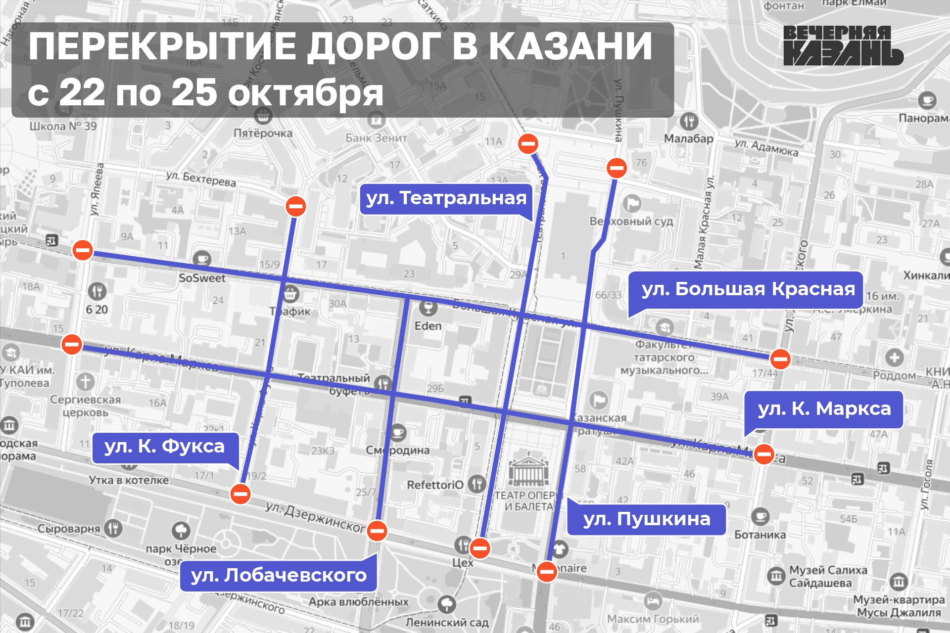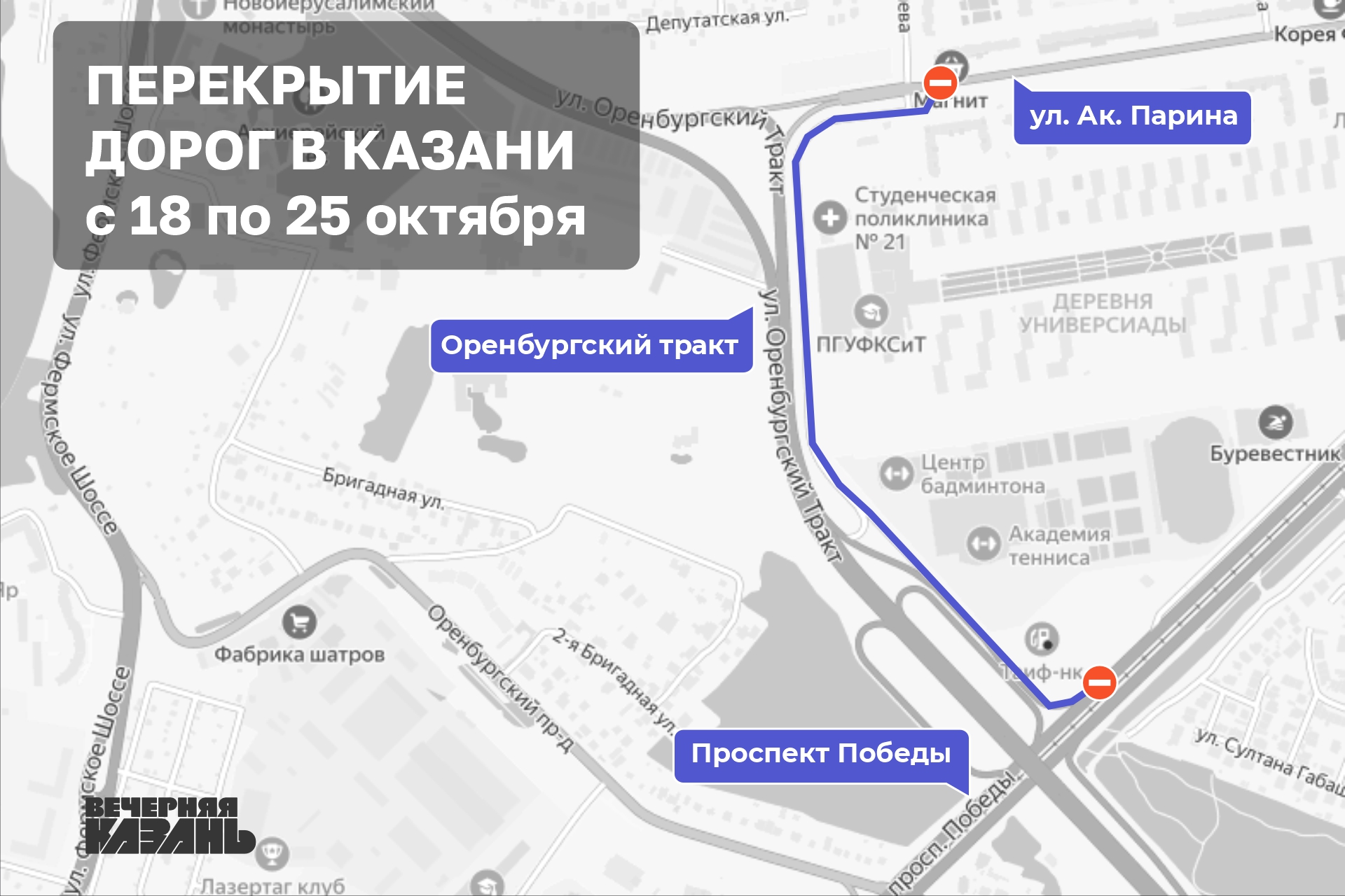 С 22 по 24 октября перекроют: проспект Универсиады до улицы Вишневского, под мостом «Миллениум» около экстрим-парка, от улицы Фатыха Амирхана до Чистопольской и до проспекта Ямашева. Запрет будет действовать и на каршеринг.