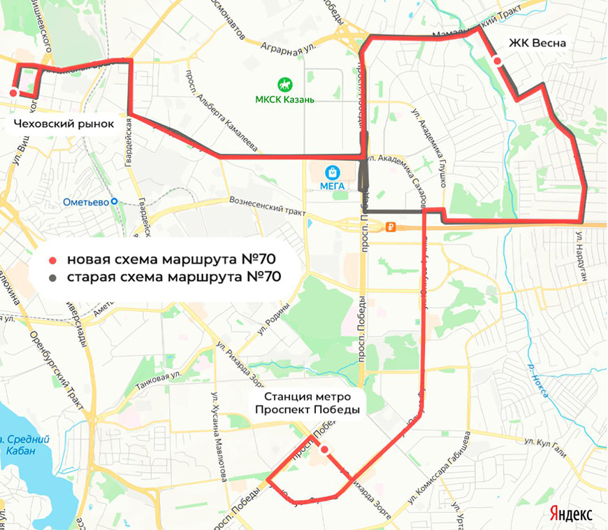 Изменения в маршрут внесли из-за строительства Вознесенского тракта и по просьбе жителей. Автобус будет ездить от Чеховского рынка до ЖК «Весна», а после - по улице Иман, дороге-дублеру Вознесенского тракта, улицам Закиева и Фучика. Станция метро «Проспект Победы» будет конечной остановкой маршрута.