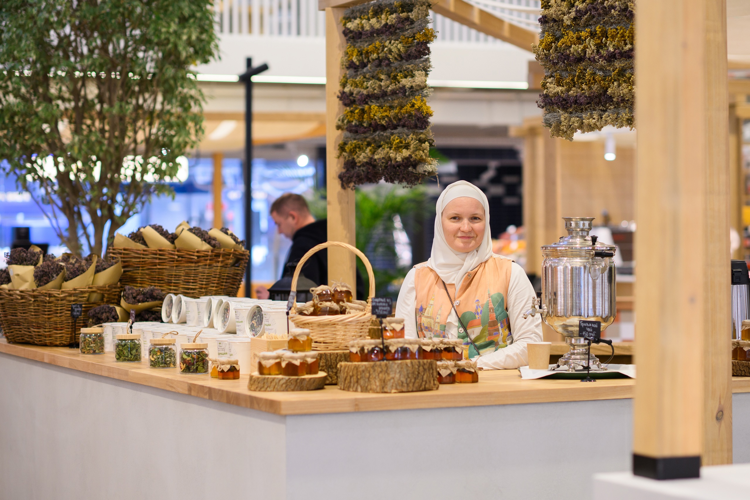 Режим работы тоже поменялся. Гостей ждут с 8 утра до 8 вечера. При входе на первый этаж посетители попадают на центральную ярмарочную площадь с амфитеатром, окруженную деревянными корнерами, напоминающими шатры. В центре площади растет живое дерево, а под ногами - импровизированный ковер из выложенной традиционными татарскими орнаментами плитки. Внешним видом занималось петербургское архитектурное бюро DA Bureau.