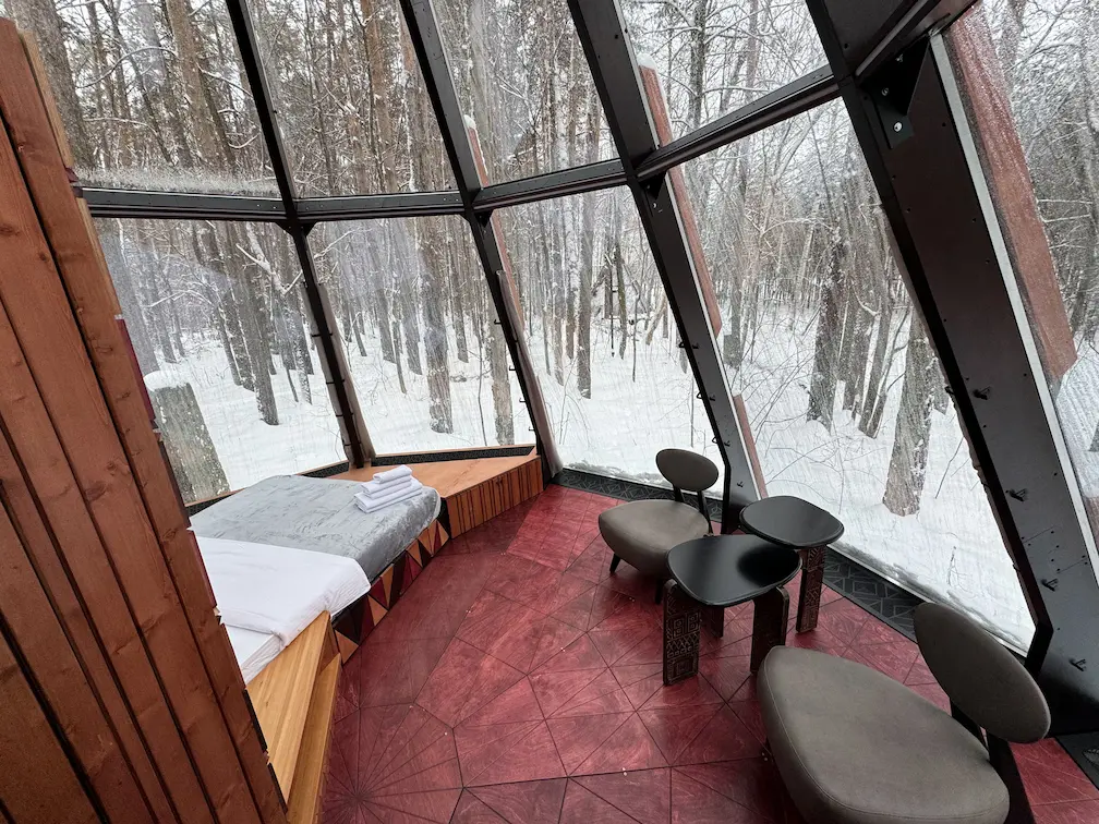 Насладиться ночными пейзажами и звёздами также можно из беседки-купола. Прозрачная сфера позволит рассмотреть каждое созвездие. А чтобы не замёрзнуть прохладной мартовской ночью и погрузиться в романтичную атмосферу, можно посидеть у костра — на территории глэмпинга есть специально оборудованная костровая чаша.