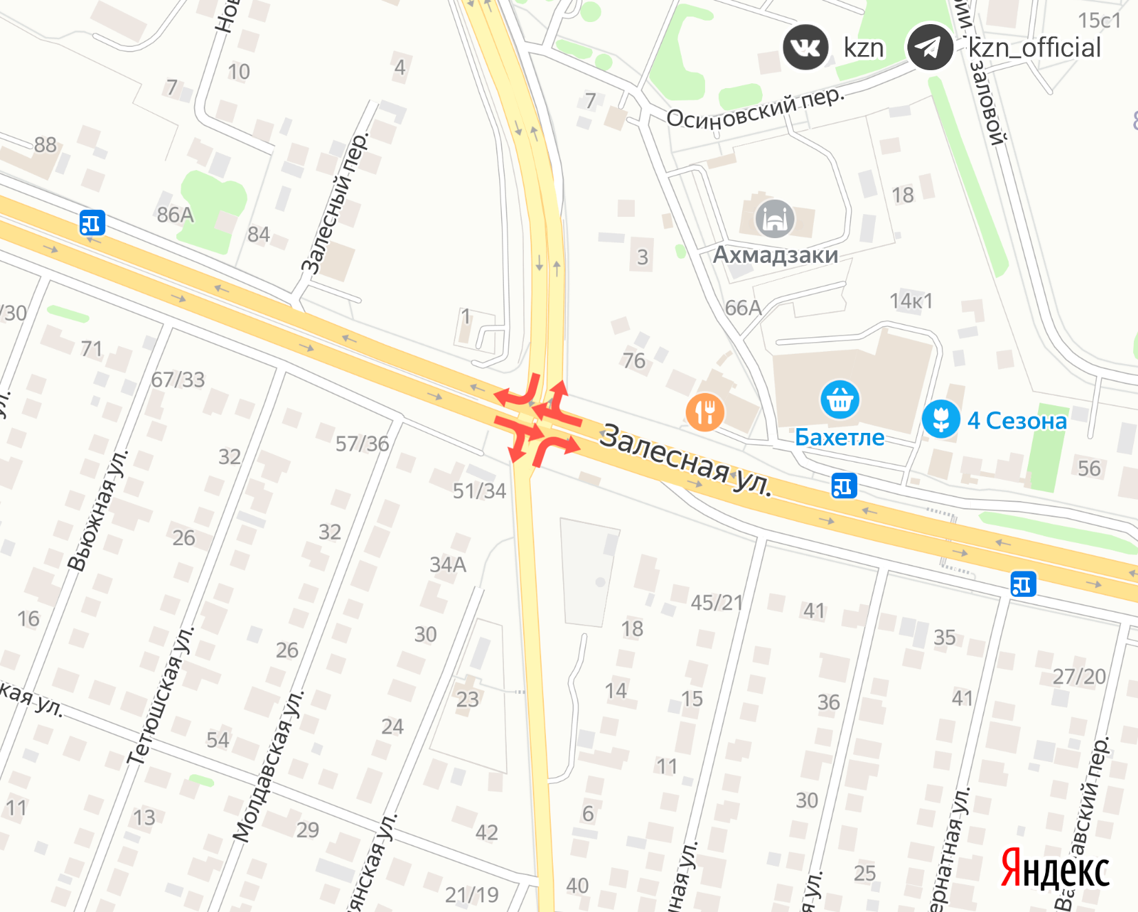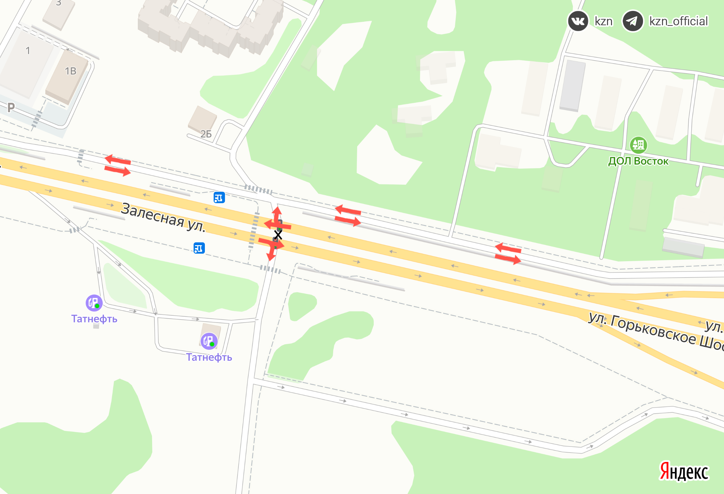 При проезде в Казань по улице Залесной на перекрестке с улицей Осиновской есть возможность поехать прямо или направо, налево проехать будет невозможно. Такая же схема движения будет организована в направлении к трассе М-7. Закроют проезд налево в поселок Юдино, но можно проехать прямо и направо. Чтобы попасть в Юдино, нужно воспользоваться разворотной петлей.