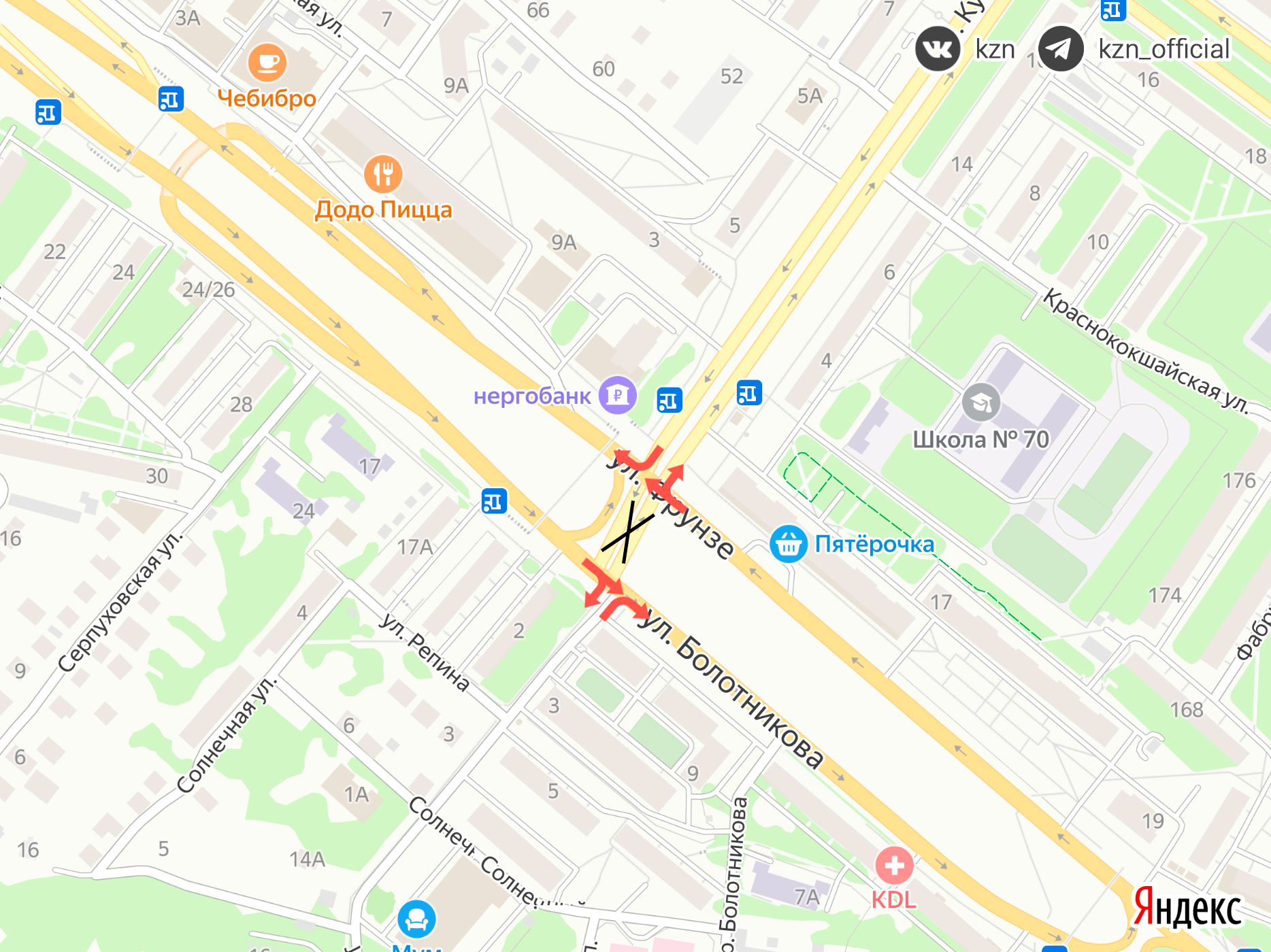 Например, при выезде с улицы Осиновской движение прямо и налево будет недоступно. Чтобы въехать в город и поселок Юдино, нужно повернуть направо и развернуться на петле, которая начинается в районе дома №96 по Залесной. А при выезде из Юдино на улицу Залесную стоит использовать поворот направо, так как закроют проезд прямо и налево. Для выезда из города необходимо развернуться на петле в районе ДОЛ «Восток».