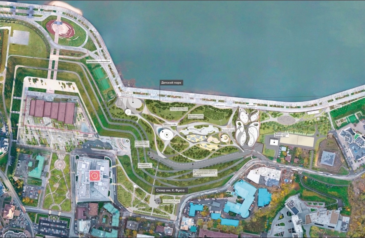 Парк сможет принимать и мероприятия - вместимость площадки составит восемь тысяч человек. Элементы парка будут отражать концепцию стратегия развития казанки, также на территории высадят природный лабиринт.