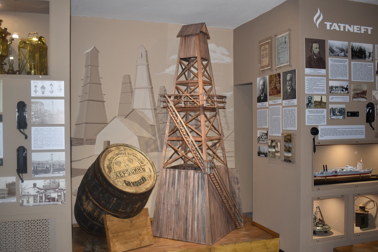 Среди главных экспонатов нового зала «Нефтяные истории» музея истории Елабуги - антикварная бочка для керосина производства Товарищества братьев Нобель, коллекция ламп, макеты дореволюционной вышки и станка-нефтекачалки.