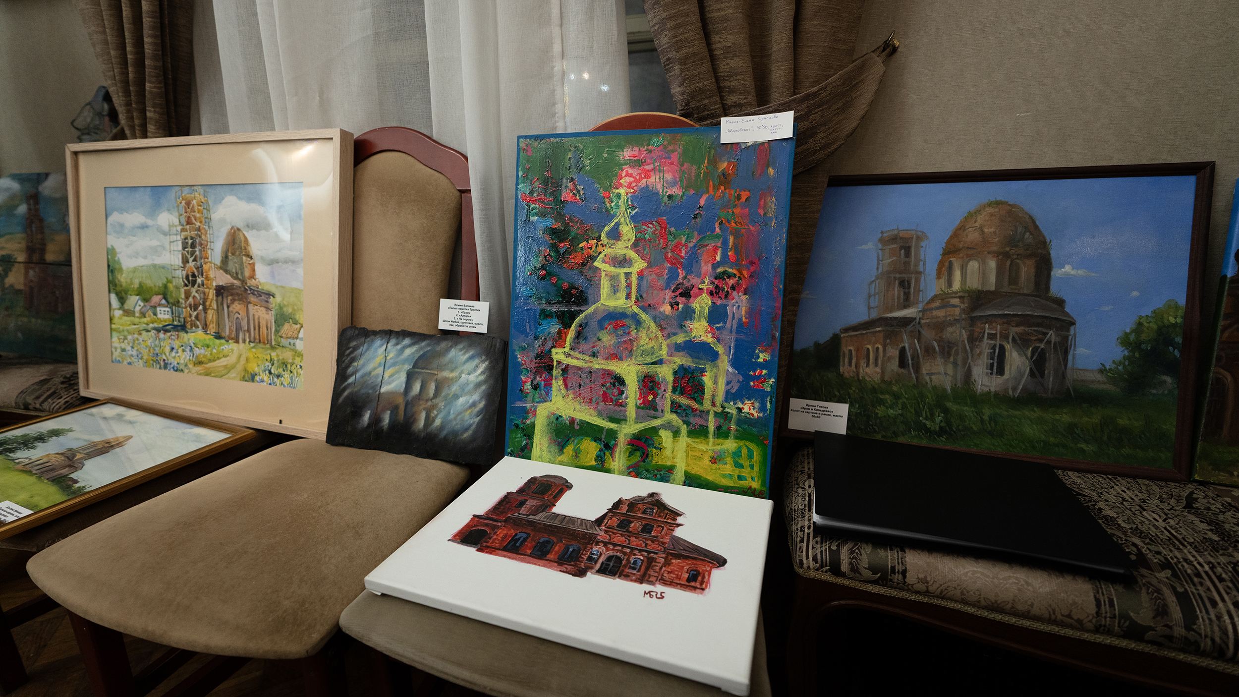 Выставленные на аукцион работы создали современные художники на пленэрах летом и осенью 2025 года: это этюды, графические рисунки, зарисовки в акварельной технике и завершенные полотна. На них запечатлены детали сельской жизни, архитектурные пейзажи, в которых отражено текущее (увы, весьма неудовлетворительное) состояние культовых сооружений, а также вольное представление живописцев об их будущем.