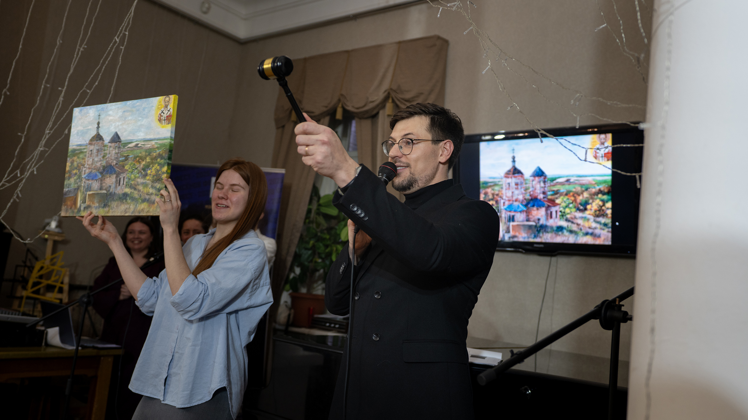 Продолжавшиеся несколько часов торги прошли в азартной атмосфере – интрига разворачивалась по восходящей: за некоторые пейзажи шла настоящая борьба. Особо трогательным стал момент, когда волонтеры из соседнего села сумели выкупить акварельный триптих и сразу же подарили его хранителям кильдеевского храма. Другая выкупленная работа будет находиться на постоянном хранении в местном Доме культуры.