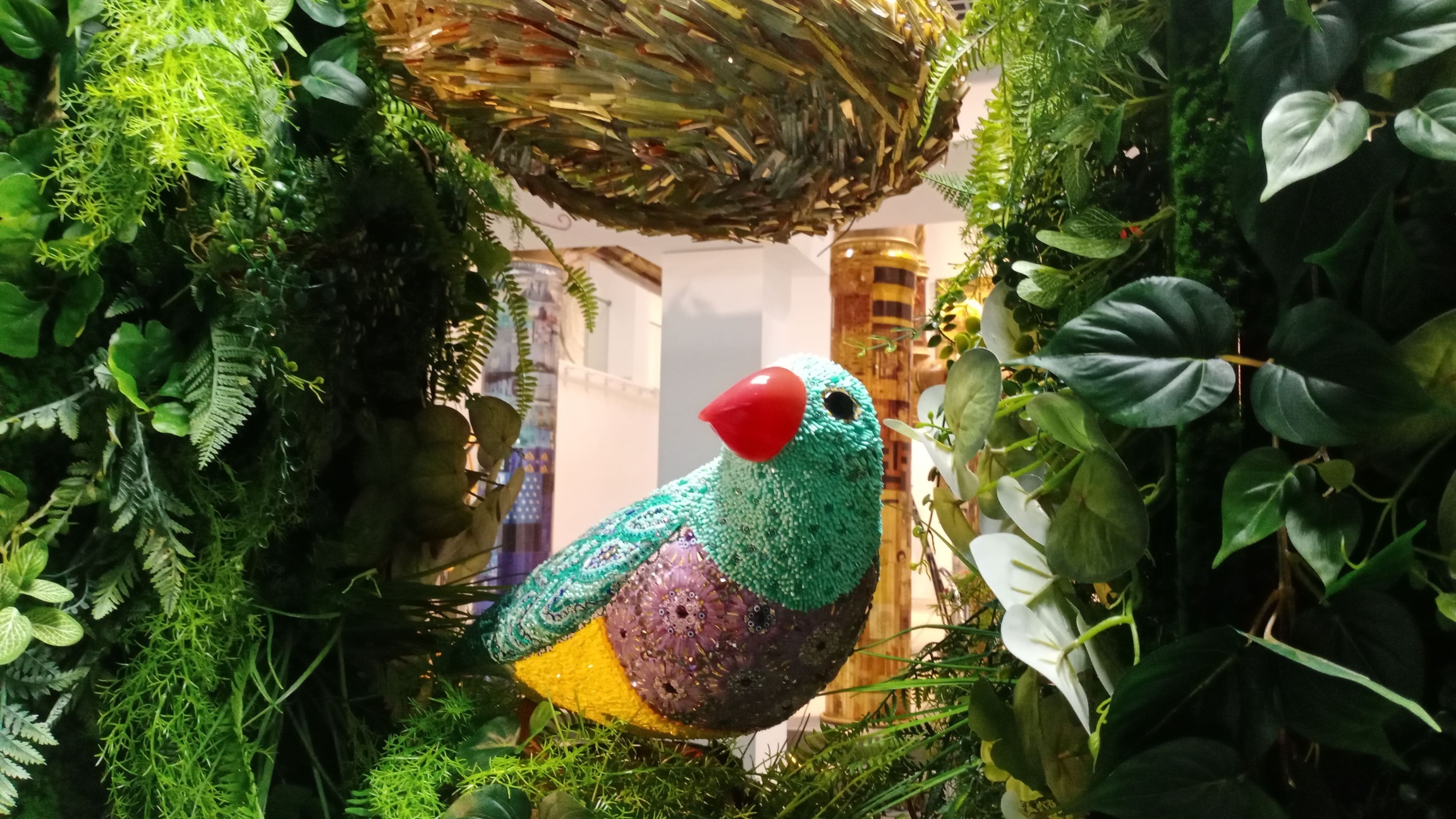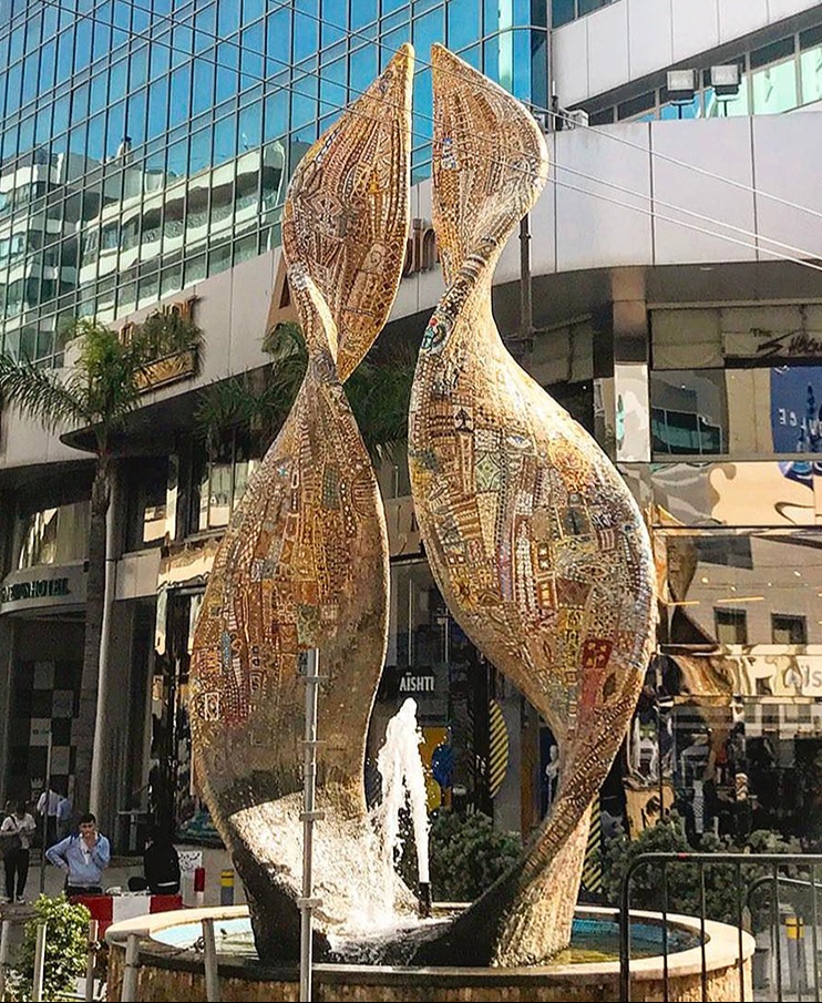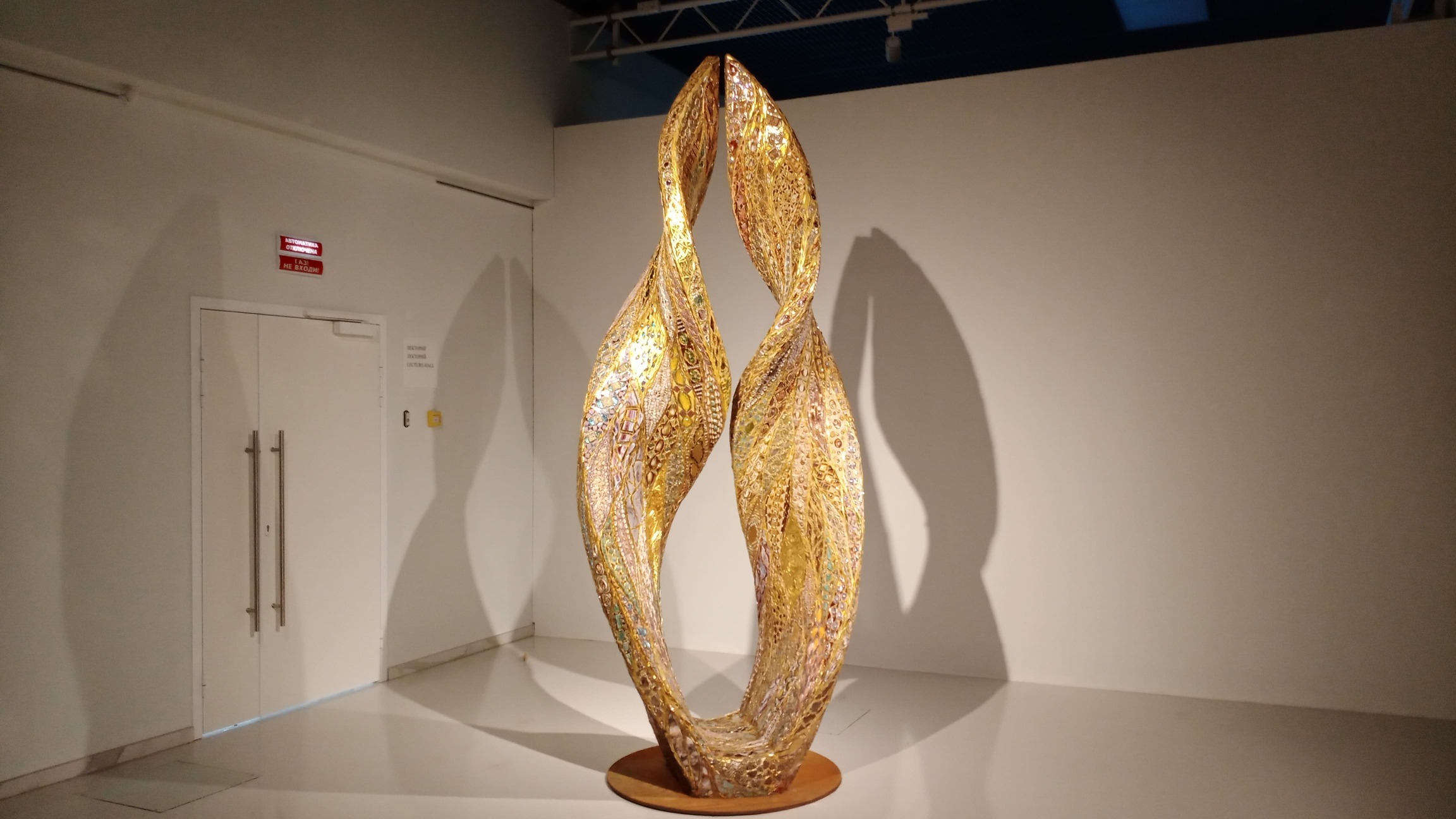 Сопроводительная аннотация сильно интригует: в скульпторе воплощено прошлое, вместившее множество событий, символов и знаний. Устремленные ввысь крылья Самрух – метафора будущих свершений, способность возвыситься и воспарить. Мозаичное оперение Самрух соткано из золотой и цветной смальты, муранского стекла, полудрагоценных камней, мрамора и перламутра. Собранные из малых фрагментов крылья скручиваются по спирали, одновременно напоминая и структуру клетки ДНК, и напоминающую символ бесконечности, открытую в 1885 году ленту Мебиуса. А вместе это означает единство и гармонию каждой микрочастицы мира в бесконечной вселенной.