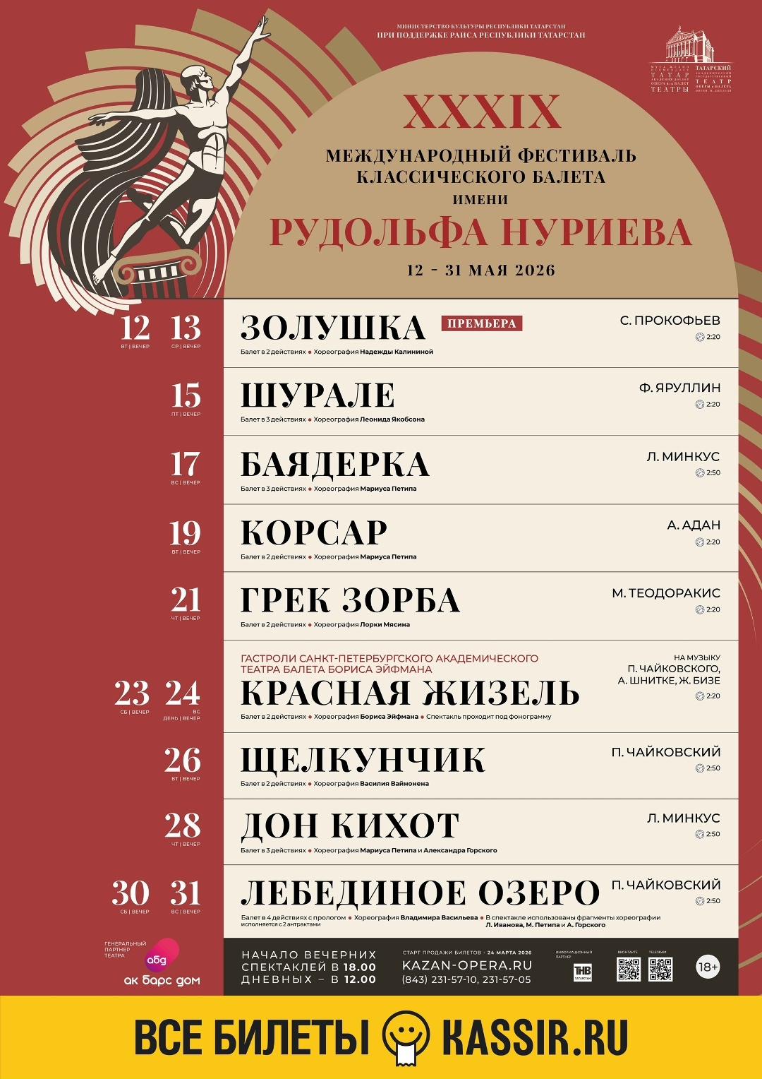 И новость номер три: 24 марта в продажу поступят билеты на XXXIX международный фестиваль классического балета им. Рудольфа Нуриева. Он откроется премьерой балета «Золушка» Сергея Прокофьева (12 и 13 мая). В афише фестиваля – лучшие казанские постановки: «Шурале» (15 мая), «Баядерка» (17 мая), «Корсар» (19 мая), «Грек Зорба» (21 мая), затем в рамках гастролей Санкт-Петербургского академического театра балета Бориса Эйфмана постановка «Красная Жизель (23 и 24 мая), «Щелкунчик» (26 мая), «Дон Кихот» (28 мая), «Лебединое озеро» в хореографии народного артиста СССР, мировой легенды Владимира Васильева (30 и 31 мая).